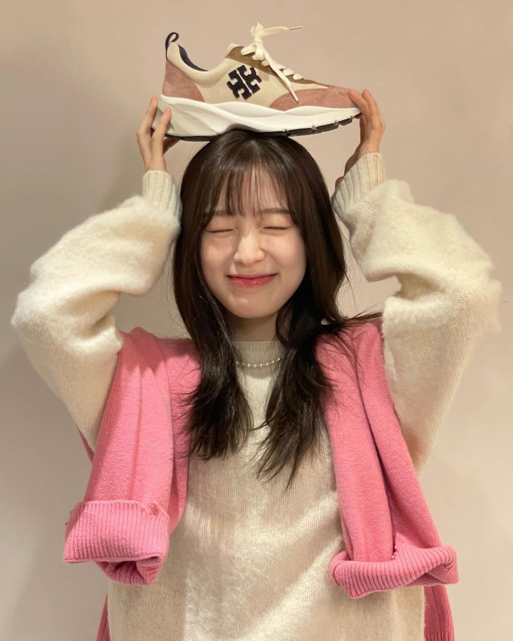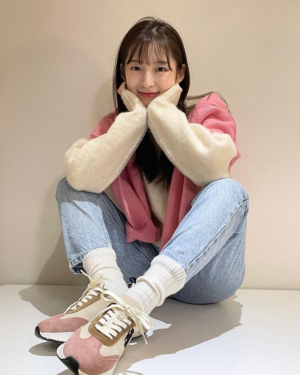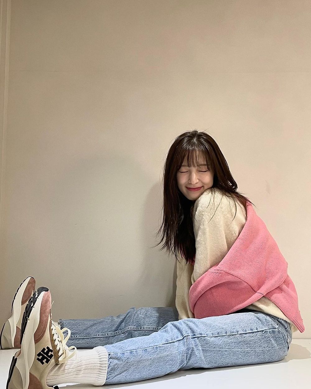 핑크 가디건을 어깨에 걸친 아린 오마이걸 - 인스타