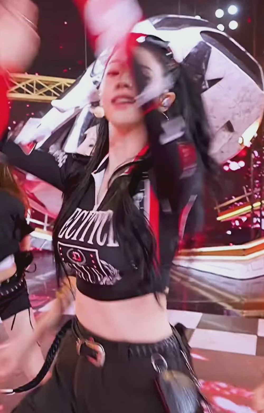 Karina's stage outfit radiates intense and active energy, pairing a black cropped top with utility pants to create a sporty yet chic vibe. This style is optimized for performance, highlighting Karina's charm even during dynamic movements. The overall ensemble utilizes a dark color palette to emphasize sophistication, with red accents and metallic accessories drawing attention. These garments transcend mere wear, representing fashion items with significant investment value and timeless appeal. The outfit also conveys a vibrant image of maintaining premium health alongside its functionality for active performances, showcasing the essence of luxury street fashion often encountered on a high-end tour.