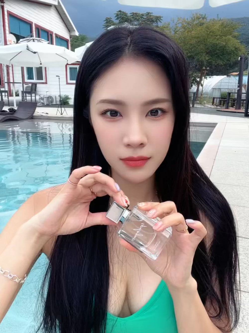 Jeonyoul presents a refreshing and relaxed poolside fashion. She wears a bright mint green swimsuit top, embodying the serene atmosphere of a premium retreat. Her natural makeup and long, straight hair contribute to a healthy and vibrant charm, evoking the freshness of a summer day. The silver bracelet and multiple rings on her hands add delicate accents, enhancing Jeonyoul's overall style. This look goes beyond simple relaxation, highlighting the importance of personal wellness care.