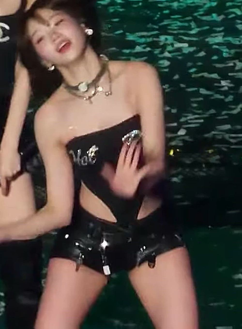사진 속 김채원은 블랙 컬러의 과감한 무대 의상을 착용하여 강렬하고 한정판적인 매력을 발산하고 있습니다. 전체적으로 몸에 밀착되는 핏과 노출이 있는 디자인은 김채원의 퍼포먼스를 더욱 돋보이게 합니다. 시크하면서도 힙한 무드가 느껴지는 스타일링으로, 자신감 넘치는 아이돌의 모습을 완벽하게 표현하고 있습니다. 이러한 스타일은 특별한 순간을 위한 의상으로, 그 자체로 투자 가치가 높은 패션 아이템으로 평가받을 수 있습니다. 마치 프리미엄 휴양지에서 즐기는 듯한 자유롭고 개성 있는 분위기를 연출합니다.