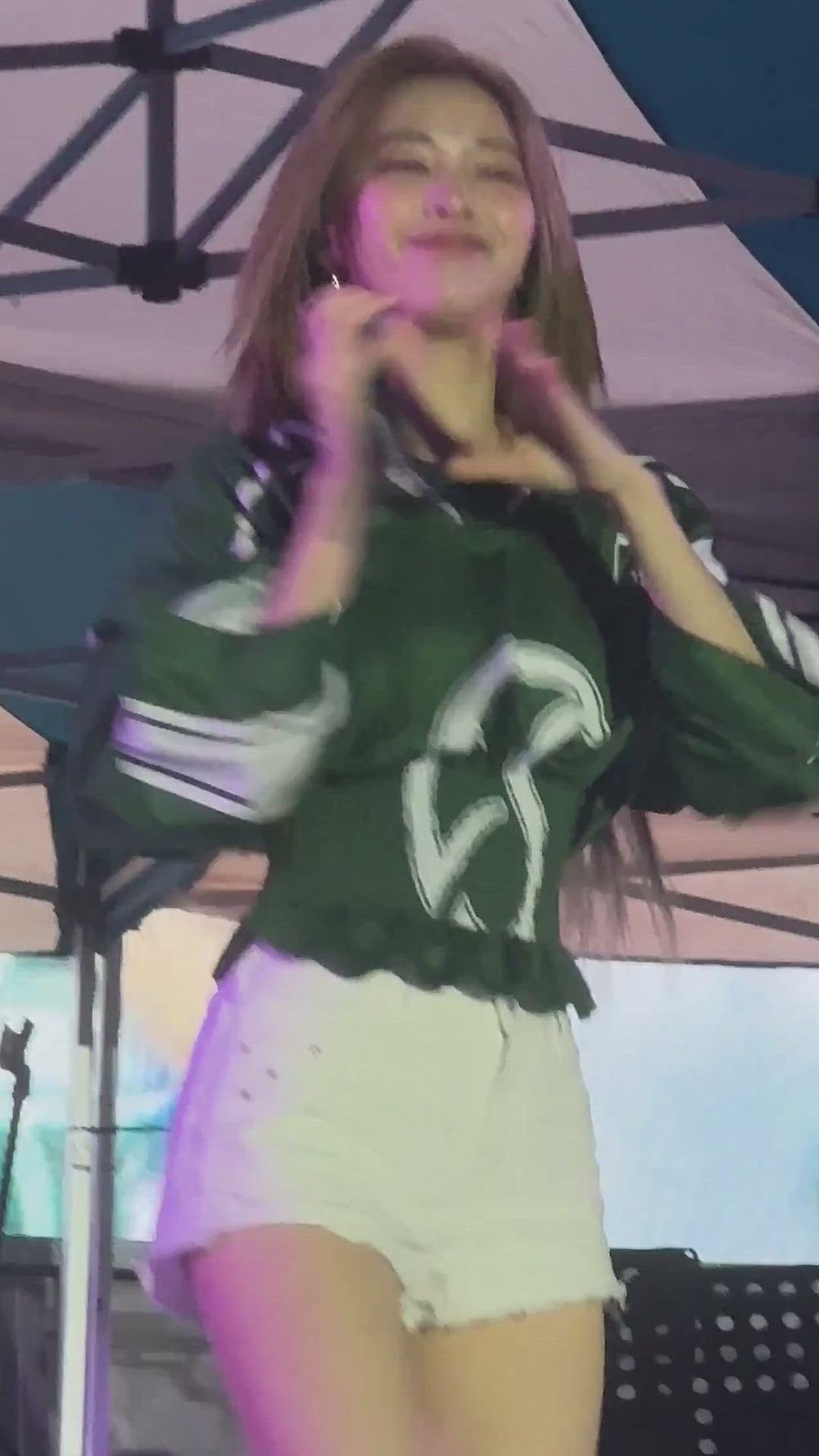 Ryujin from ITZY presents a casual and trendy urban look, showcasing vibrant energy through her stage attire. She pairs a dark green cropped top with bright shorts, creating an active yet sophisticated vibe. Overall, this lighthearted and comfortable styling further highlights Ryujin's charm.