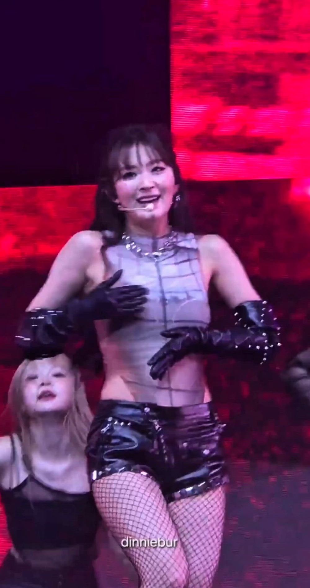 Seulgi presents a charismatic image through her powerful stage outfit. This chic style, consisting of a sheer top, leather shorts, and fishnet stockings, highlights her charm. Metallic accessories and studded details complete the glamorous look with a rock-chic vibe. Overall, it is a bold yet refined performance fashion statement.