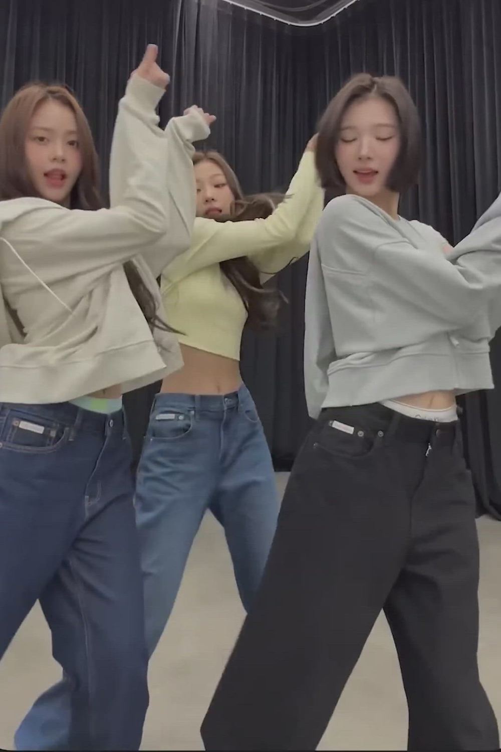 Carmen's colorful underwear band, slightly visible above her pants, acts as an accessory, adding a focal point. Jiwoo's white Calvin Klein logo underwear band is exposed above her pants, adding a stylish touch. Stella is not wearing any specific accessories.