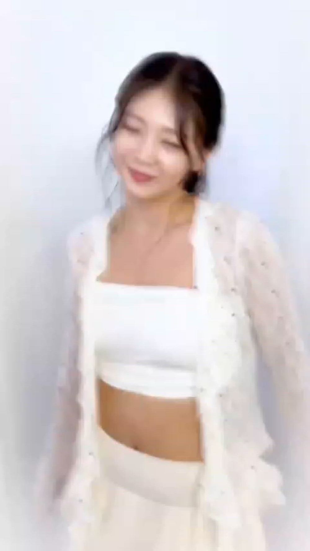 In this image, Everglow's Onda presents a fresh and elegant aura with a feminine style white-toned outfit. The overall bright ivory color palette emphasizes a pure and clean image, while the lightweight sheer cardigan and crop top coordination create a cool yet sophisticated summer fashion. Paired with a flowing bottom, this ensemble showcases a comfortable yet chic appeal, highlighting her delicate femininity.