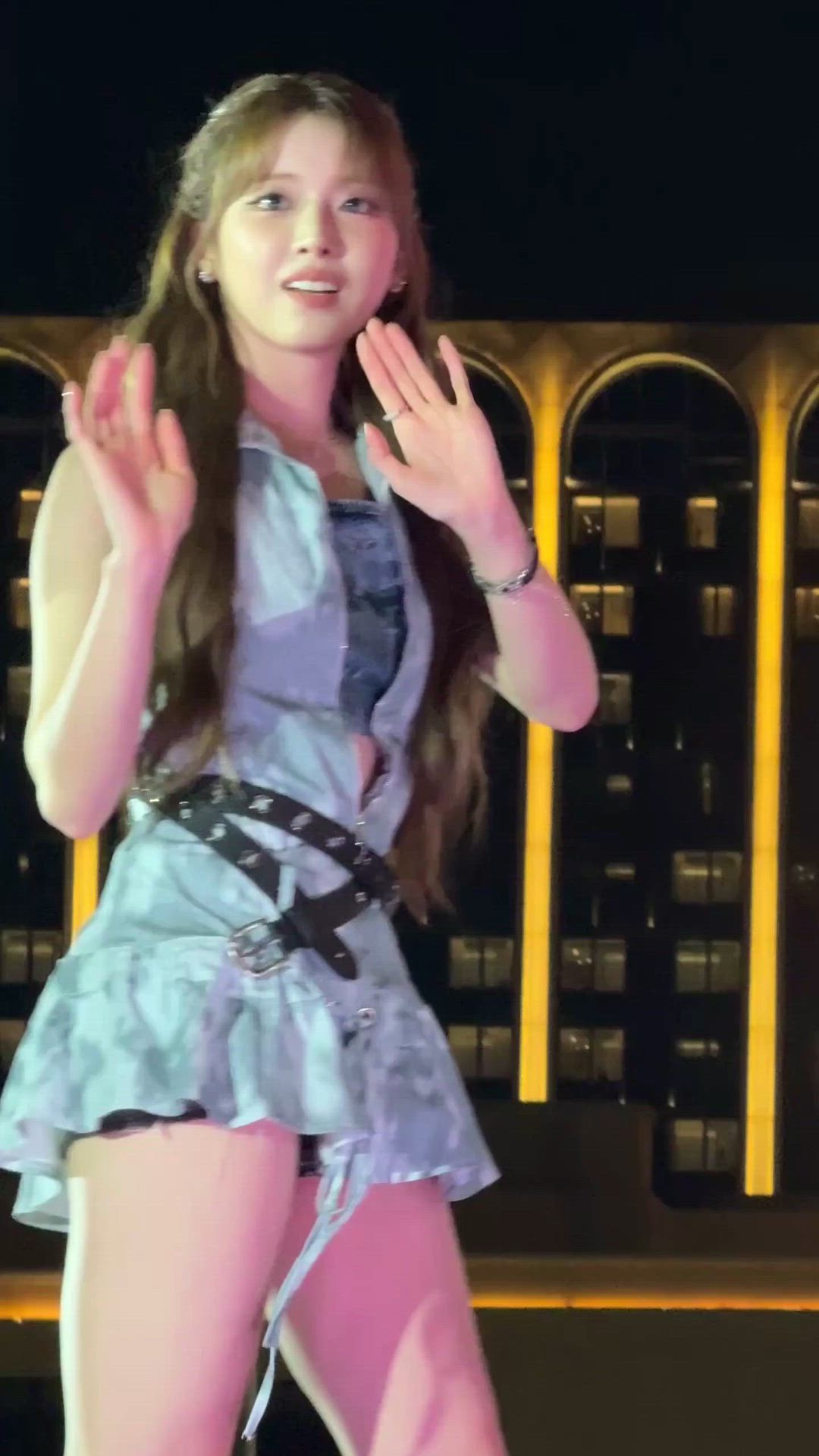 NMIXX Jiwoo는 무대 위에서 빛나는 데님 패션을 선보입니다. 밝은 하늘색 계열의 타이다이 패턴이 돋보이는 크롭 민소매 셔츠와 러플 미니 스커트를 매치하여 통일감 있는 세트업 스타일을 연출했습니다. 여기에 여러 개의 버클과 스터드 장식이 있는 블랙 벨트를 착용하여 전체적인 룩에 엣지 있고 강렬한 스트리트 패션 무드를 더했습니다. 활동적이면서도 개성 넘치는 스타일로, 아이돌의 에너지를 잘 표현하는 무대 의상입니다.