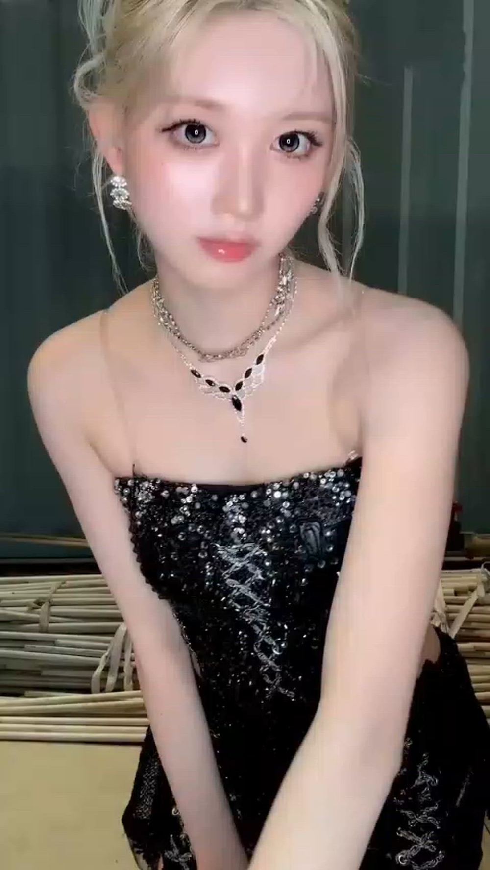 아이브 가을은 화려하고 글램룩 스타일의 의상을 선보입니다. 반짝이는 블랙 시퀸 튜브톱 드레스를 착용하여 무대 위나 특별한 행사에서 돋보이는 고급스러운 분위기를 연출합니다. 여러 겹의 실버 톤 목걸이와 화려한 귀걸이로 전체적인 스타일을 더욱 화려하게 완성하고 있습니다.