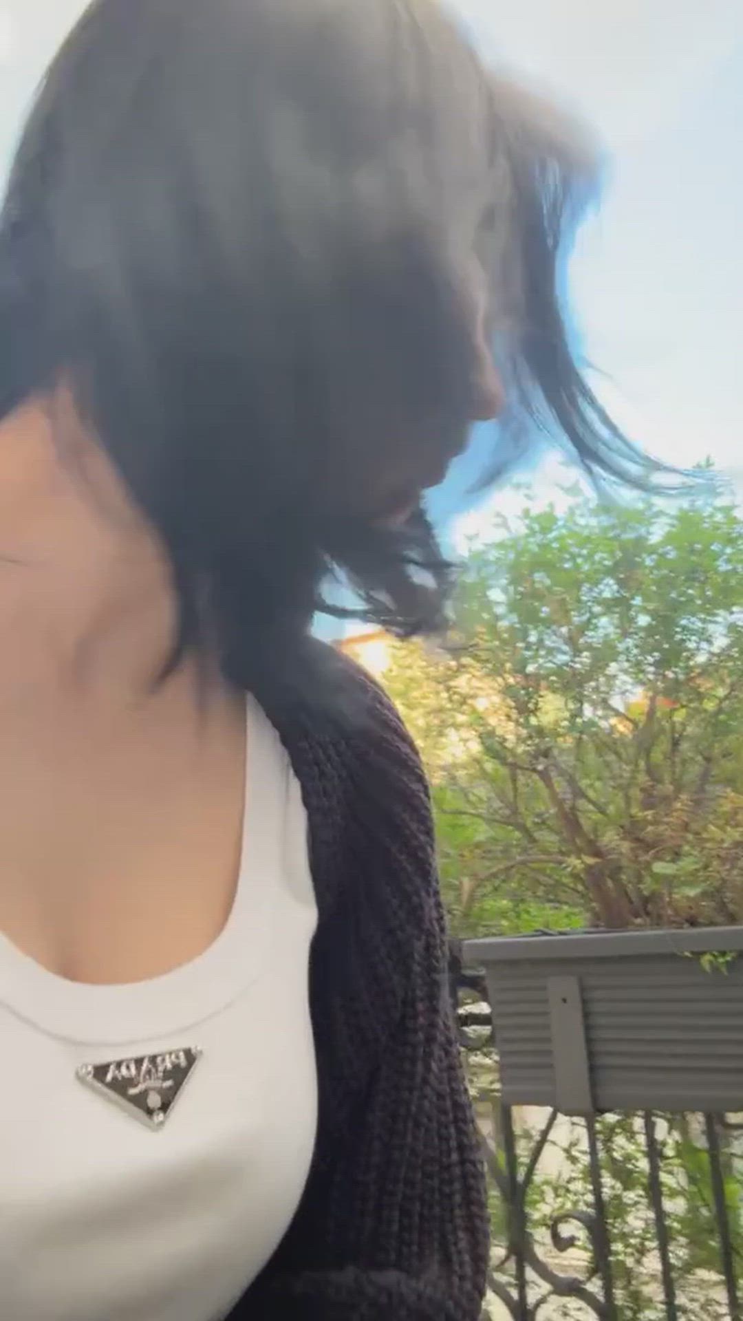 Karina presents a comfortable yet luxury casual style. She pairs a simple white tank top with a dark-toned knit cardigan, creating a cozy yet sophisticated ambiance. The iconic logo detail attached to the top adds a touch of luxury to the overall look, emphasizing a seemingly effortless yet chic charm. Overall, the outfit showcases a natural yet trendy everyday wear style.