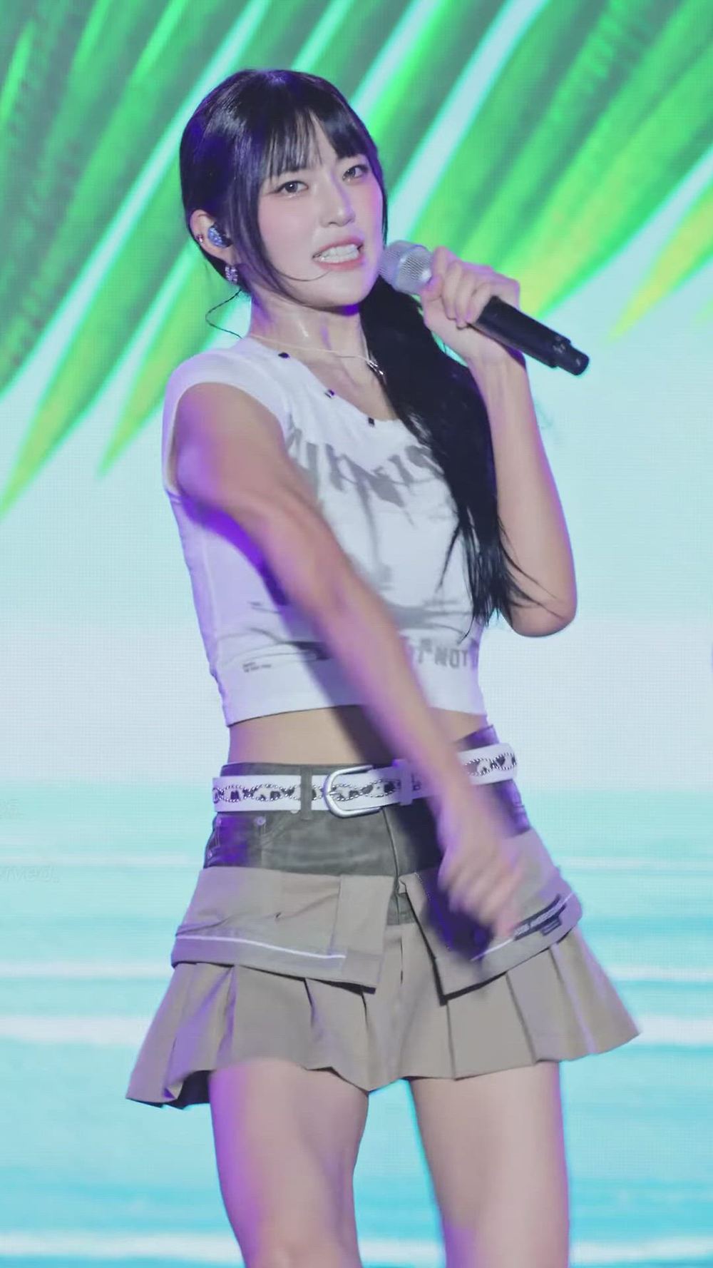 하이키 옐은 크롭탑과 플리츠 미니 스커트를 매치하여 트렌디한 스테이지룩을 선보입니다. 흰색의 민소매 상의와 카키색 플리츠 스커트의 조화는 활동적이면서도 청량한 분위기를 연출합니다. 허리에 착용한 독특한 패턴의 벨트는 전체적인 스타일에 개성 있는 포인트를 더하며, 옐의 건강하고 활기찬 매력을 돋보이게 합니다.