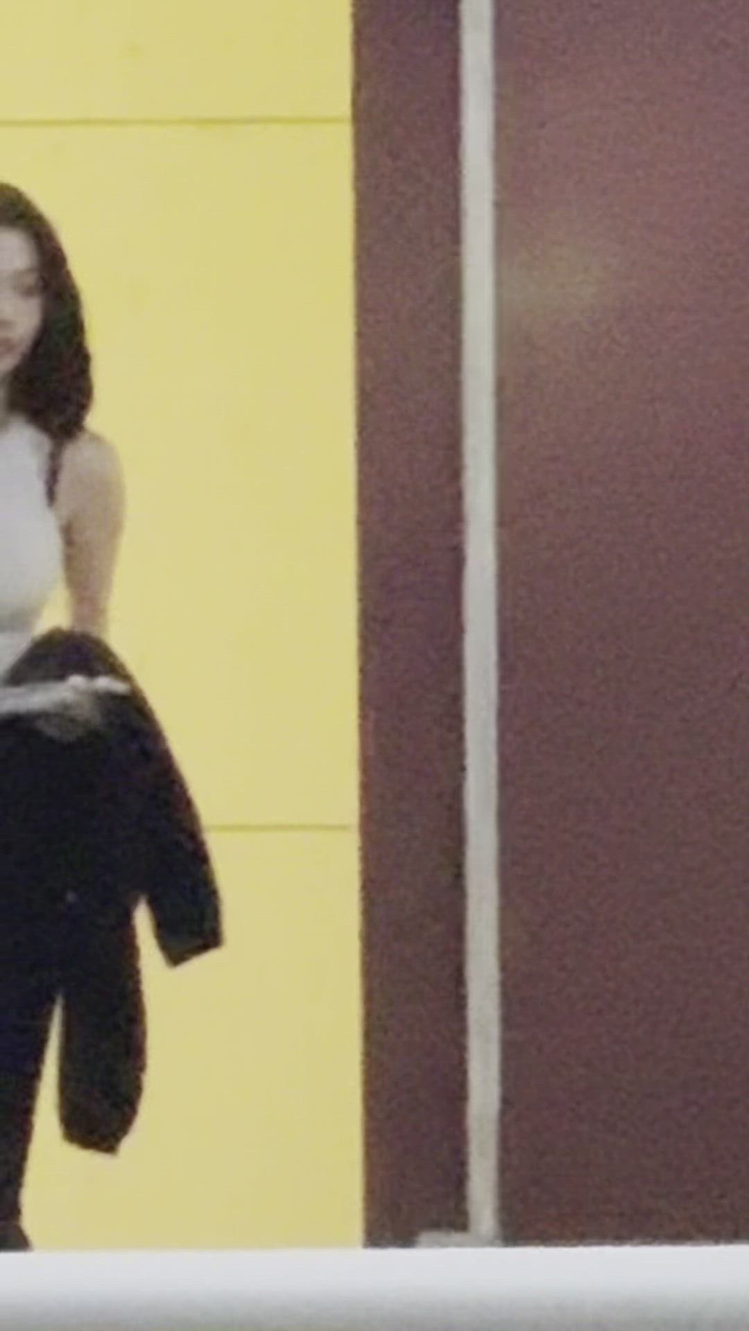 In this image, Karina presents a comfortable yet chic daily fashion look. She pairs a white sleeveless top with dark bottoms, creating a clean and minimalist aesthetic. The black outerwear held in her hand appears to be a practical item for transitional weather or indoor use. Overall, her attire exudes an effortless charm, appearing both polished and relaxed.