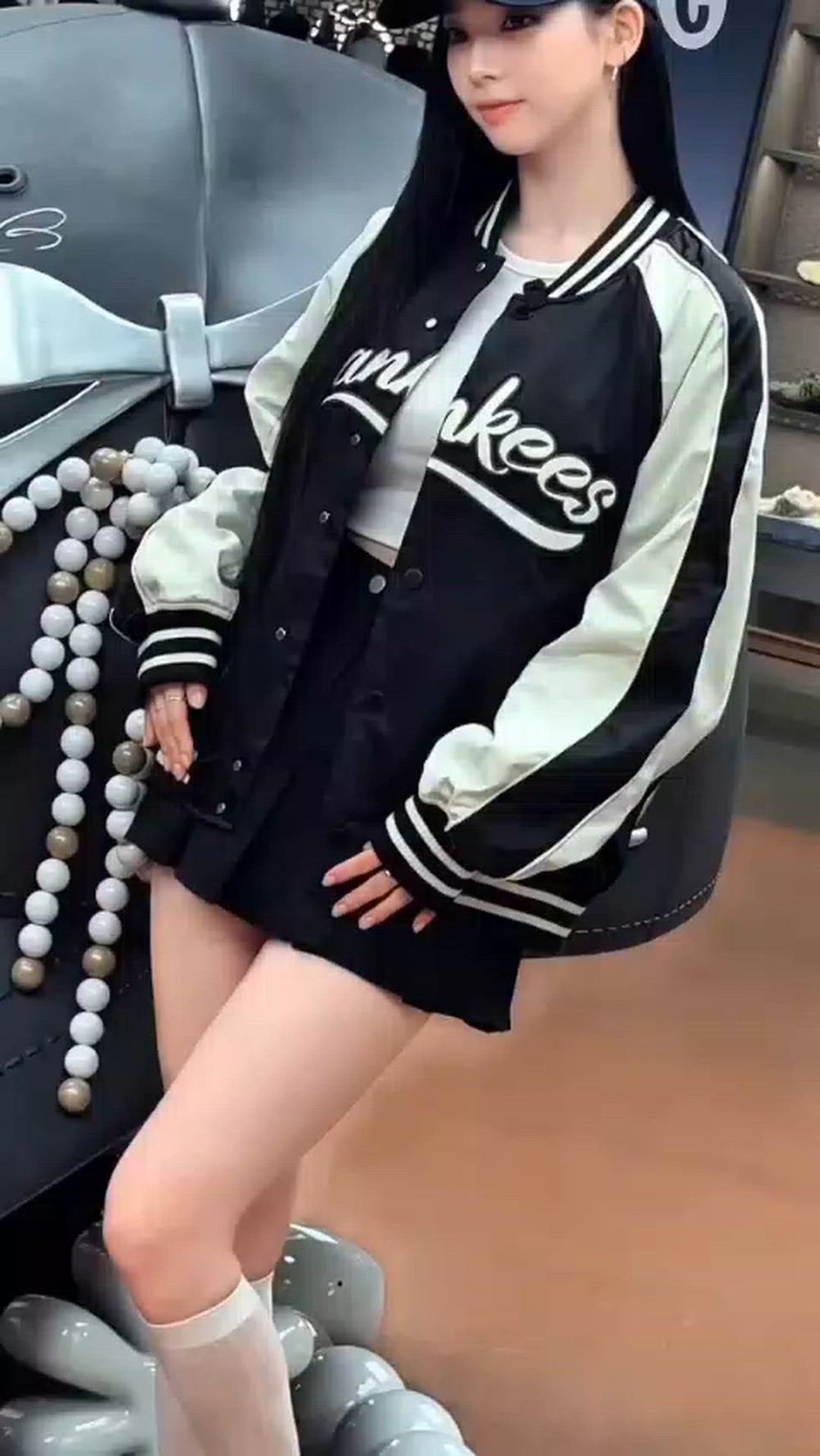 aespa-Karina presents a casual and active style, highlighting a streetwear aesthetic. She is wearing a black and white varsity jacket as the focal point, paired with a neat inner top and bottom, creating an overall sporty yet trendy vibe. The jacket's logo detail, mini skirt, and knee-high socks add a youthful and fashionable touch to her look. aespa-Karina effortlessly embodies a comfortable yet stylish everyday outfit.