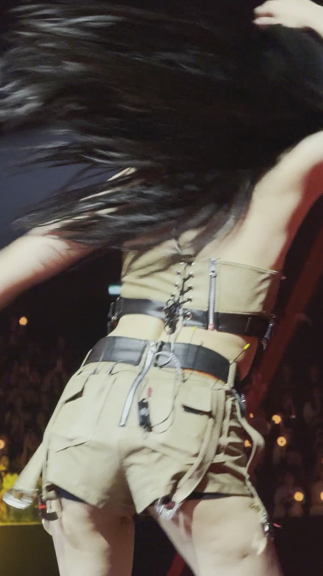 TWICE's Mina is showcasing a powerful streetwear aesthetic. She pairs a beige-toned corset top with cargo shorts, creating an active yet distinctive stage presence. The ensemble perfectly blends military-inspired elements with hip-hop sensibilities, resulting in a bold and trendy outfit that enhances the performance's energy. Sophisticated details come together to complete a captivating style.