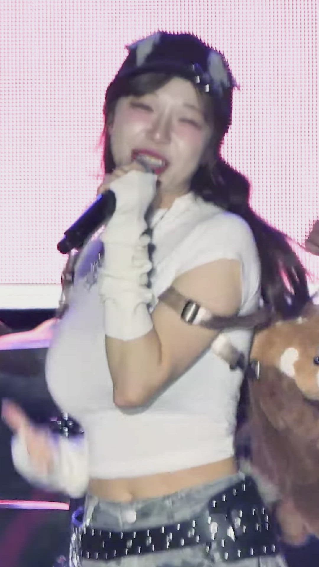 ZZONE (Jeewon)은 아이돌 패션의 발랄함과 힙한 스트릿웨어 감성을 조화롭게 연출하고 있습니다. 전체적으로 캐주얼하면서도 개성 강한 아이템들을 활용하여 젊고 트렌디한 분위기를 자아냅니다. 특히 크롭탑과 로우라이즈 데님, 그리고 독특한 액세서리 조합이 눈길을 끄는 스타일입니다. 무대 의상으로 보이는 이 패션은 활동적인 퍼포먼스에 잘 어울리는 편안하면서도 스타일리시한 매력을 보여줍니다.