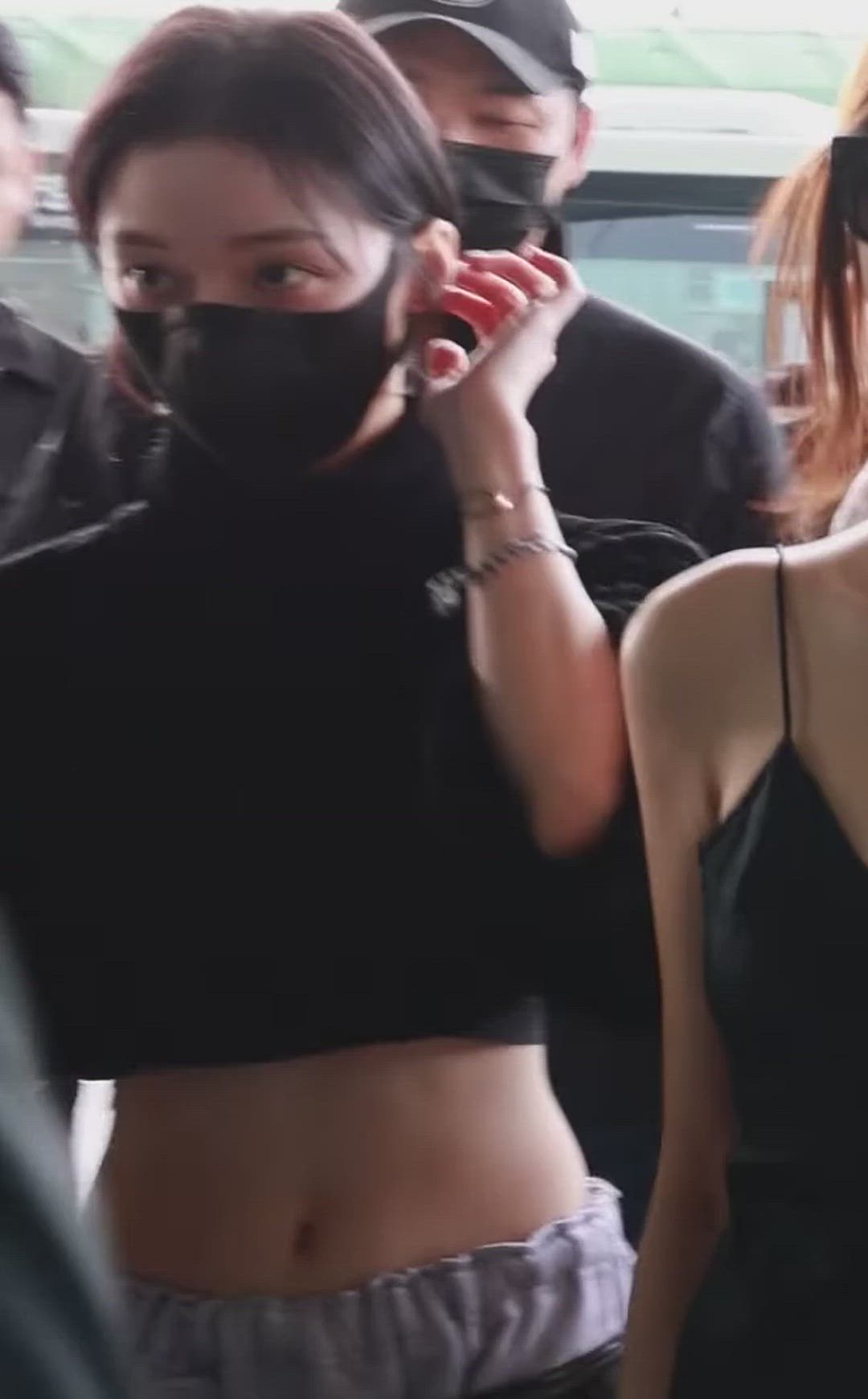 윈터는 캐주얼하면서도 세련된 공항 패션을 선보였습니다. 블랙 크롭 터틀넥 상의와 연보라색 스웨트팬츠를 매치하여 편안하면서도 활동적인 스타일을 연출했습니다. 전체적으로 간결한 컬러 조합과 실루엣으로 캐주얼 시크의 정수를 보여주며, 꾸민 듯 안 꾸민 듯 자연스러운 매력을 강조하고 있습니다. 편안한 착용감과 스타일리시함을 동시에 잡은 룩입니다.