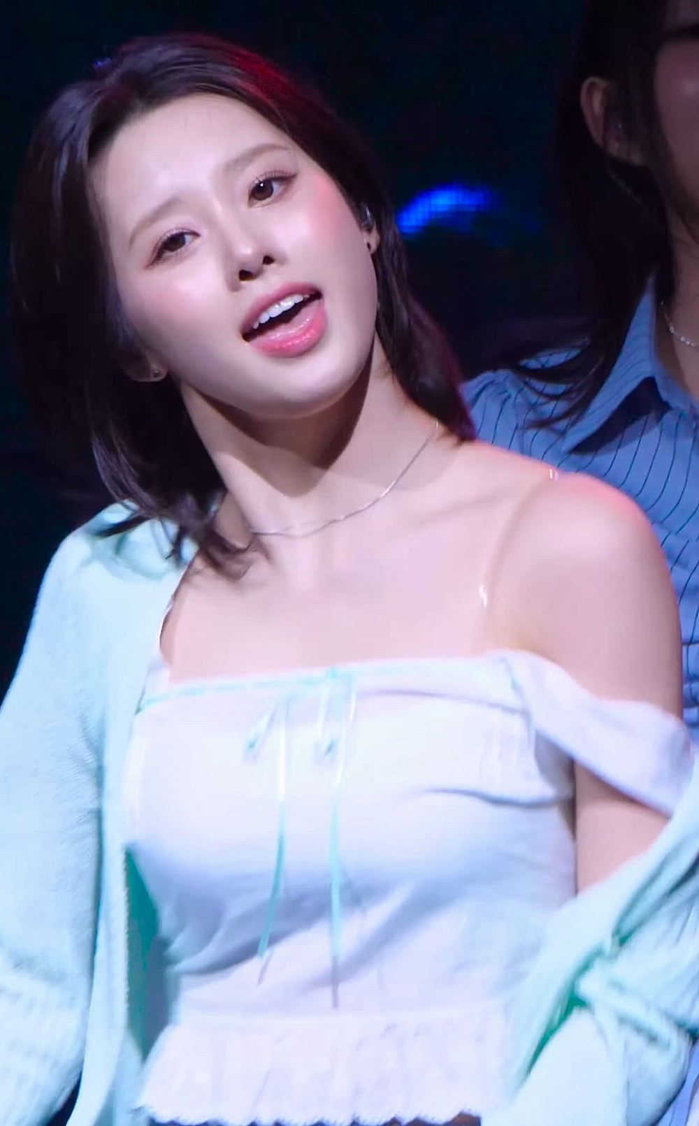 라잇썸의 나영은 상큼하고 청량한 분위기의 여름 패션을 선보입니다. 파스텔톤의 민트색 카디건과 흰색 오프숄더 톱을 매치하여 부드럽고 사랑스러운 페미닌룩을 연출했습니다. 전체적으로 시원하고 가벼운 소재를 활용하여 편안하면서도 스타일리시한 여름코디를 완성합니다.