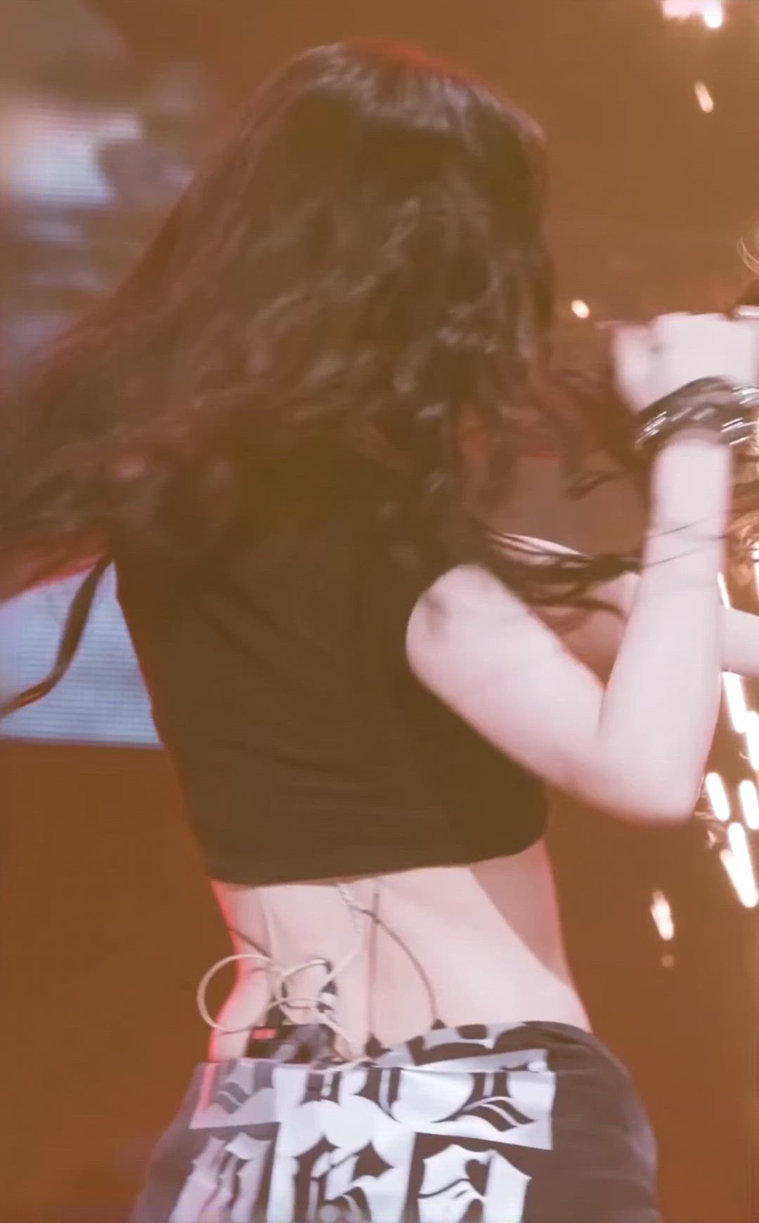 윈터는 스트리트웨어 스타일의 무대 의상을 착용하여 강렬하고 아이코닉한 분위기를 연출하고 있습니다. 짧은 기장의 블랙 크롭 상의와 독특한 패턴이 돋보이는 하의를 매치하여 활동적인 매력을 강조합니다. 특히 하의 뒷부분의 코르셋 디테일은 독특한 디자인 요소를 더하며, 전체적으로 과감하면서도 스타일리시한 무대 패션을 완성합니다.