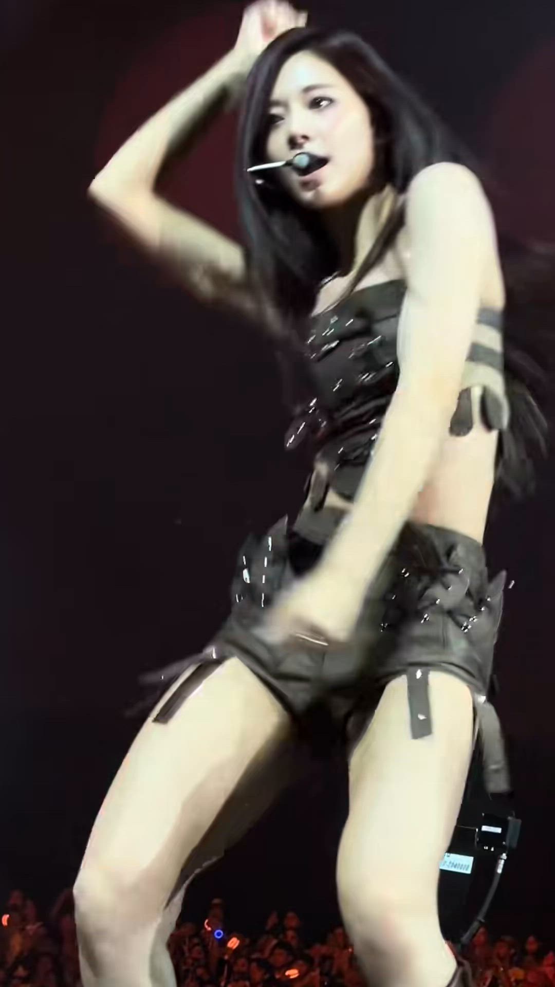TWICE's Tzuyu showcases a powerful and chic style that appears to be a stage outfit. She pairs a dark-toned crop top with matching shorts, creating a cohesive glam punk aesthetic. Metallic details add a touch of sparkle and edgy charm, perfectly complementing Tzuyu's charismatic performance in this performance wear. This style is also ideal for a concert or a festival look.