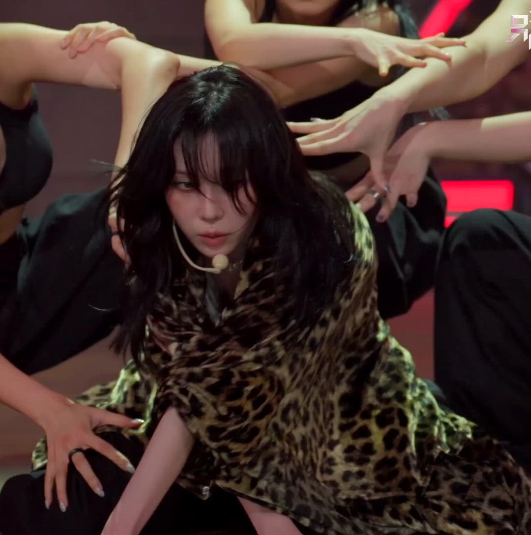 Winter is wearing a classic brown-toned leopard print top. This top features a loose fit that drapes around the body, emphasizing mobility while creating a sophisticated stage look. Made from a soft, flexible material, it is suitable for active performances, and the bold animal print leaves a strong impression. It exudes a similar vibe to the daring designs seen at Saint Laurent or Versace.