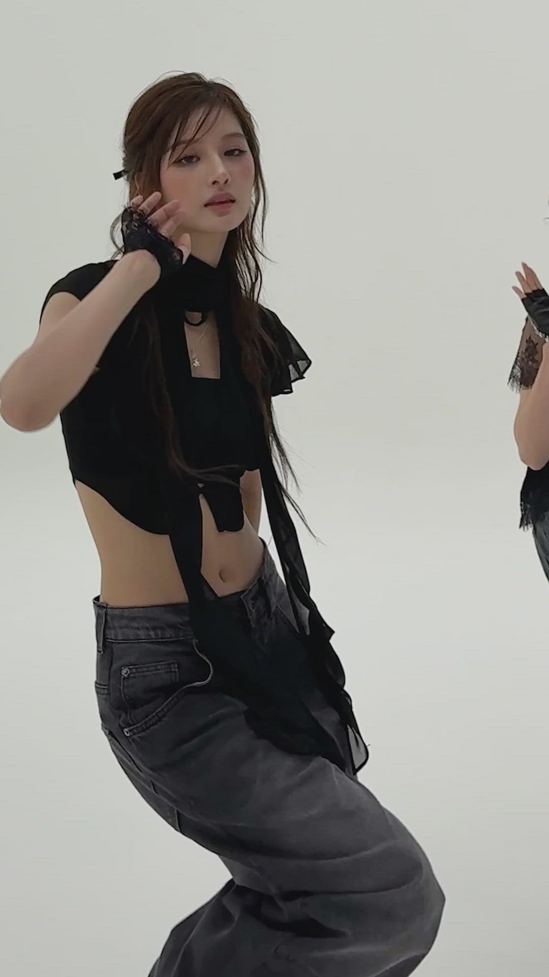 Sullyoon presents a trendy and distinctive style, pairing a boldly exposed crop top with vintage-inspired washed denim jeans. The overall black and dark gray palette creates a chic and dreamy atmosphere. The top's ribbon details and lace gloves add delicate accents to the look, completing a sophisticated styling suitable for idol stage fashion.