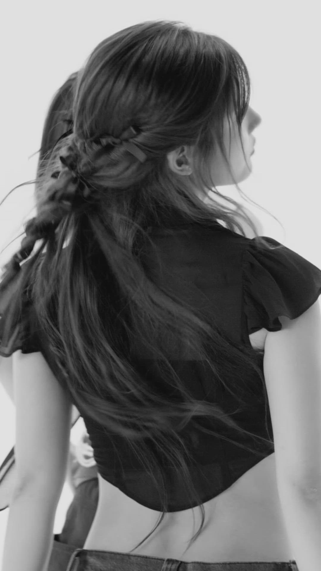 머리카락의 일부를 땋아 올린 하프업 스타일을 연출했으며, 땋은 머리 끝에 어두운 색상의 리본이나 헤어 타이를 사용하여 포인트를 주었습니다. 이러한 헤어 액세서리는 전체적인 룩에 세련된 디자인의 청순한 매력을 더해줍니다. 디올이나 샤넬 같은 브랜드에서 고급스러운 헤어 액세서리를 찾아볼 수 있습니다.