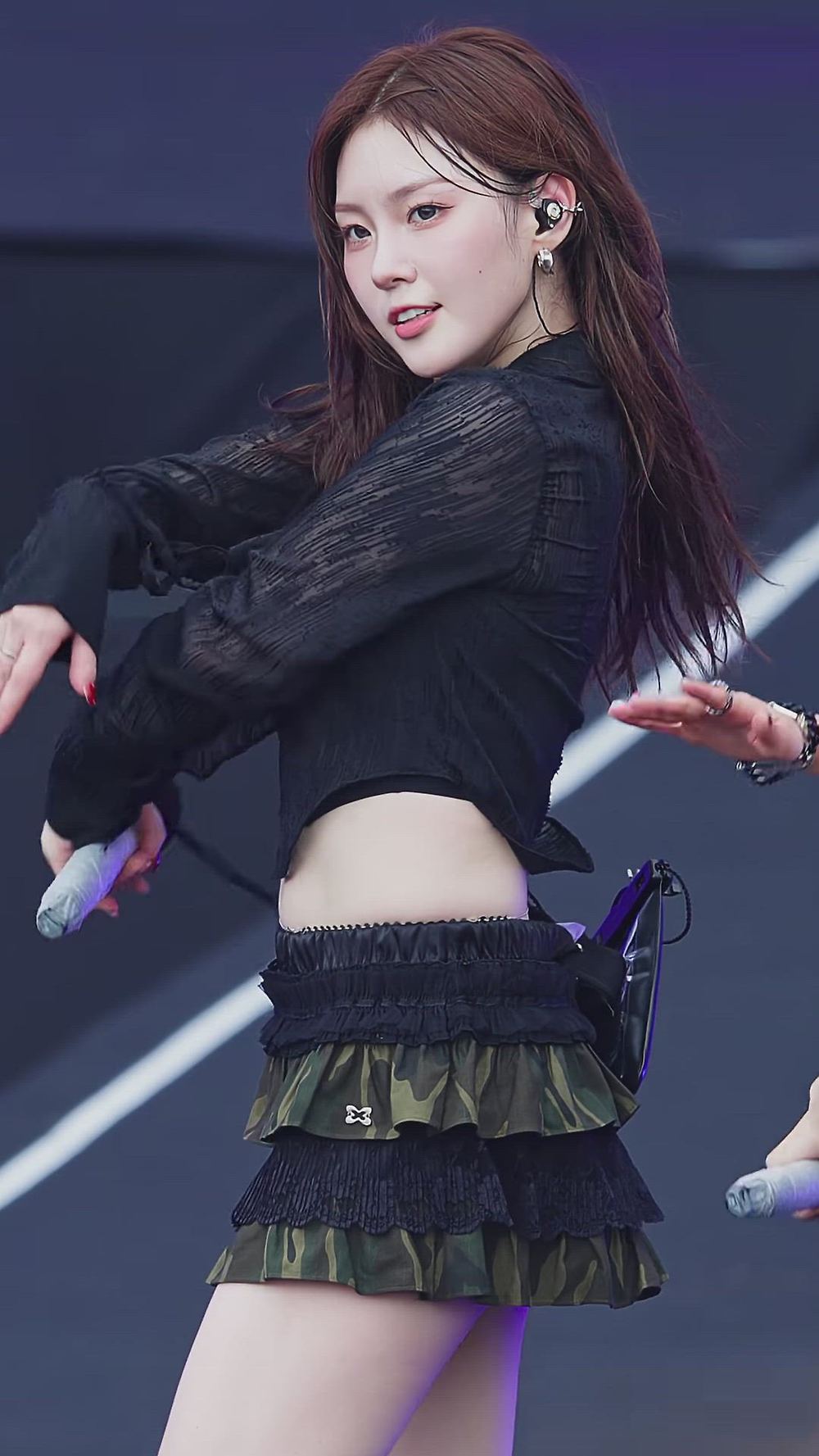 Kep1er's Chaehyun presents a powerful yet sophisticated style on stage, combining a sheer black shirt with a military pattern mini skirt. The top is styled in a cropped length, emphasizing her waistline and adding an active charm. Overall, this chic and trendy stage outfit captures attention.