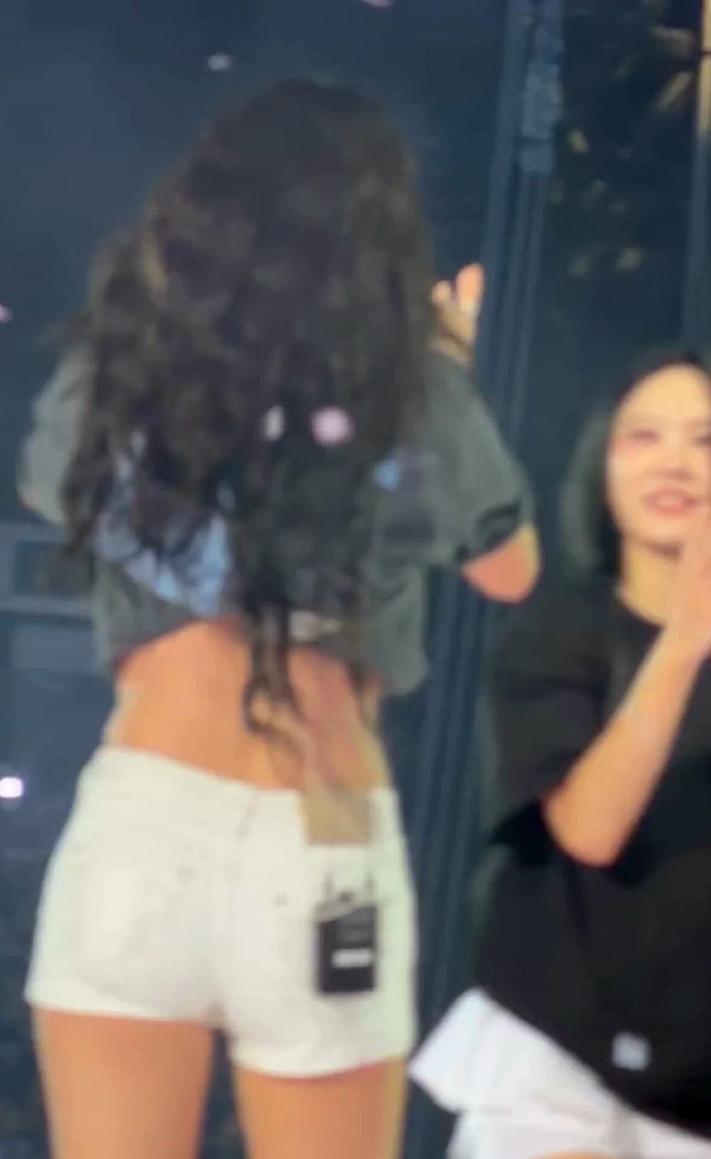 지효는 편안하면서도 활동적인 데일리룩을 선보이고 있습니다. 크롭 티셔츠와 데님 숏츠를 매치하여 시원하고 경쾌한 분위기를 연출합니다. 이러한 캐주얼 스타일은 무대 위에서의 에너지 넘치는 퍼포먼스를 돋보이게 하며, 일상생활에서도 쉽게 따라 할 수 있는 실용적인 코디입니다. 전체적으로 심플하지만 젊고 활기찬 매력을 강조하는 무대 의상입니다.