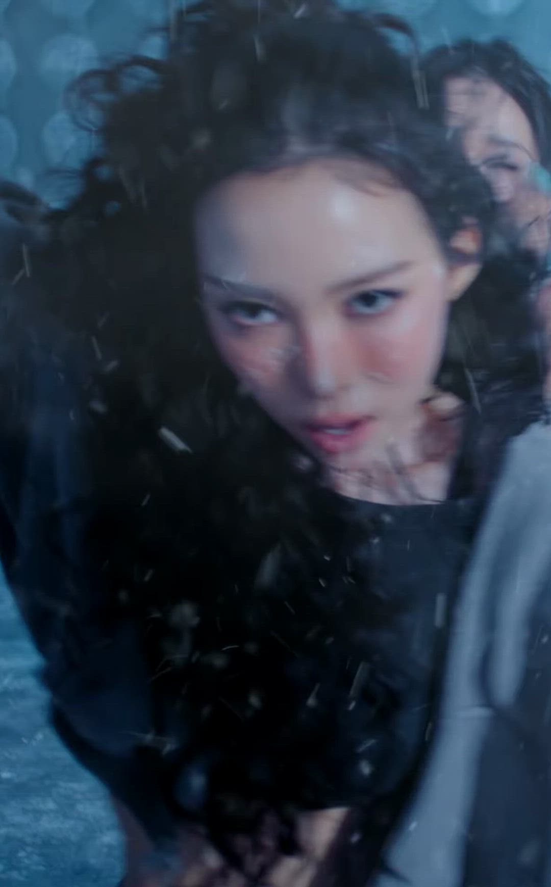 Narin presents a captivating look that blends a dark chic allure with a futuristic vibe. The overall dark-toned attire, combined with avant-garde makeup, creates a dreamy yet powerful impression. The frosty makeup on her eyebrows and cheeks adds a cool touch, while her curly hairstyle enhances the mystical atmosphere. This sophisticated darkness is truly striking.
