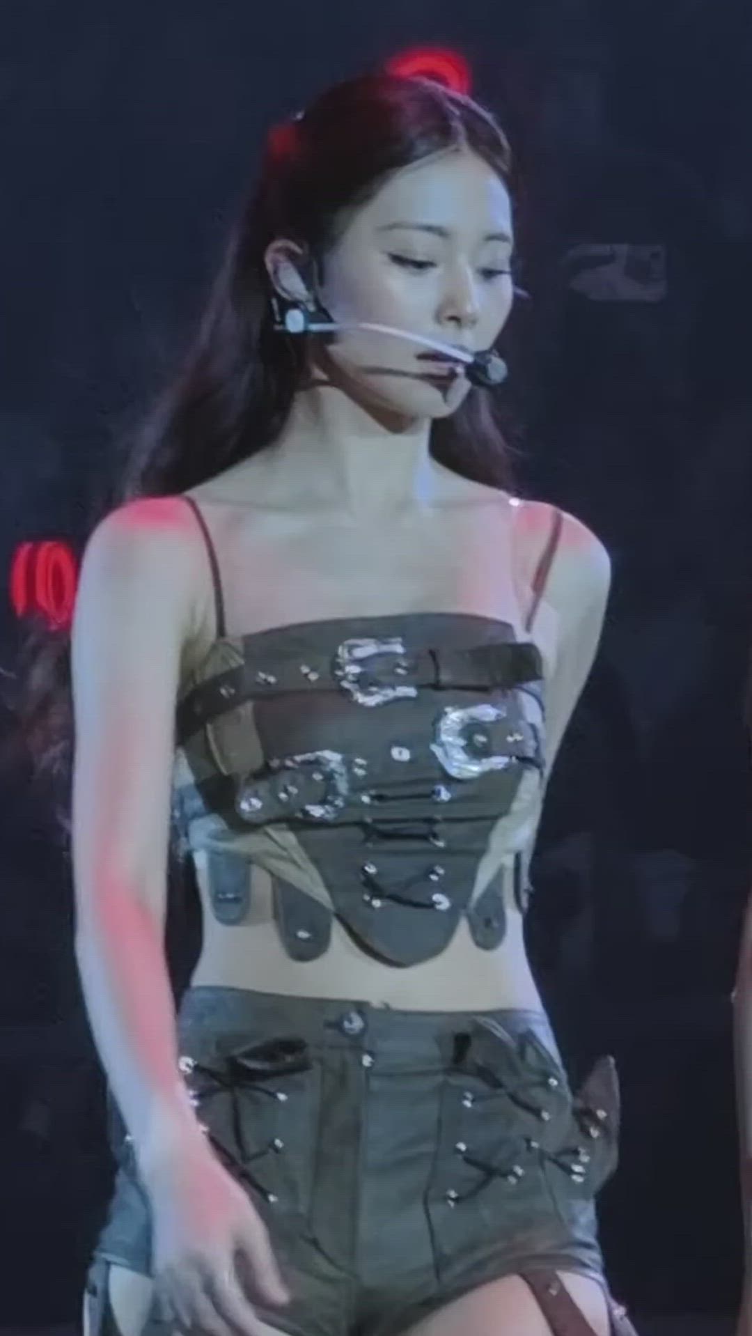 TWICE TZUYU presents a powerful and bold stage outfit, exuding charismatic charm. She pairs a dark-toned corset top with matching shorts, creating an edgy aesthetic. The numerous buckles, studs, and intricate strap detailing amplify the rock-chic vibe, further highlighting TZUYU's sophisticated image. This ensemble is optimally designed for an alluring stage performance.