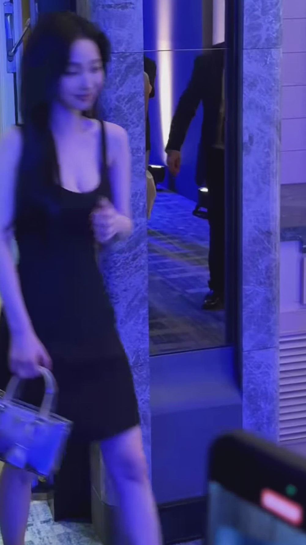 Karina showcases a sophisticated charm by wearing a simple yet elegant black slim-fit mini dress. The thin shoulder strap design and short length create a harmonious modern vibe, while a transparent handbag adds a focal point, completing a luxurious look. Overall, the clean and minimalist styling emphasizes Karina's graceful silhouette.