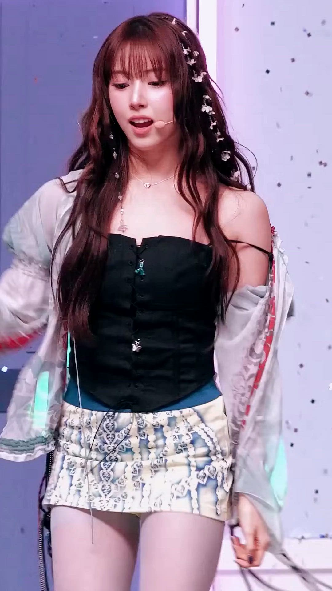 NMIXX 지우는 무대 위에서 화려하고 레이어드 스타일의 의상을 선보이고 있습니다. 검은색 코르셋 탑을 중심으로, 얇고 시스루한 소재의 연회색 아우터를 어깨에 걸쳐 우아하면서도 강렬한 인상을 줍니다. 하의로는 독특한 문양의 패턴 스커트를 매치하여 전체적인 룩에 개성을 더했습니다. 긴 웨이브 헤어에 작은 꽃 장식과 섬세한 목걸이, 바디 체인 액세서리를 더해 몽환적이면서도 세련된 무대 의상을 완성합니다.