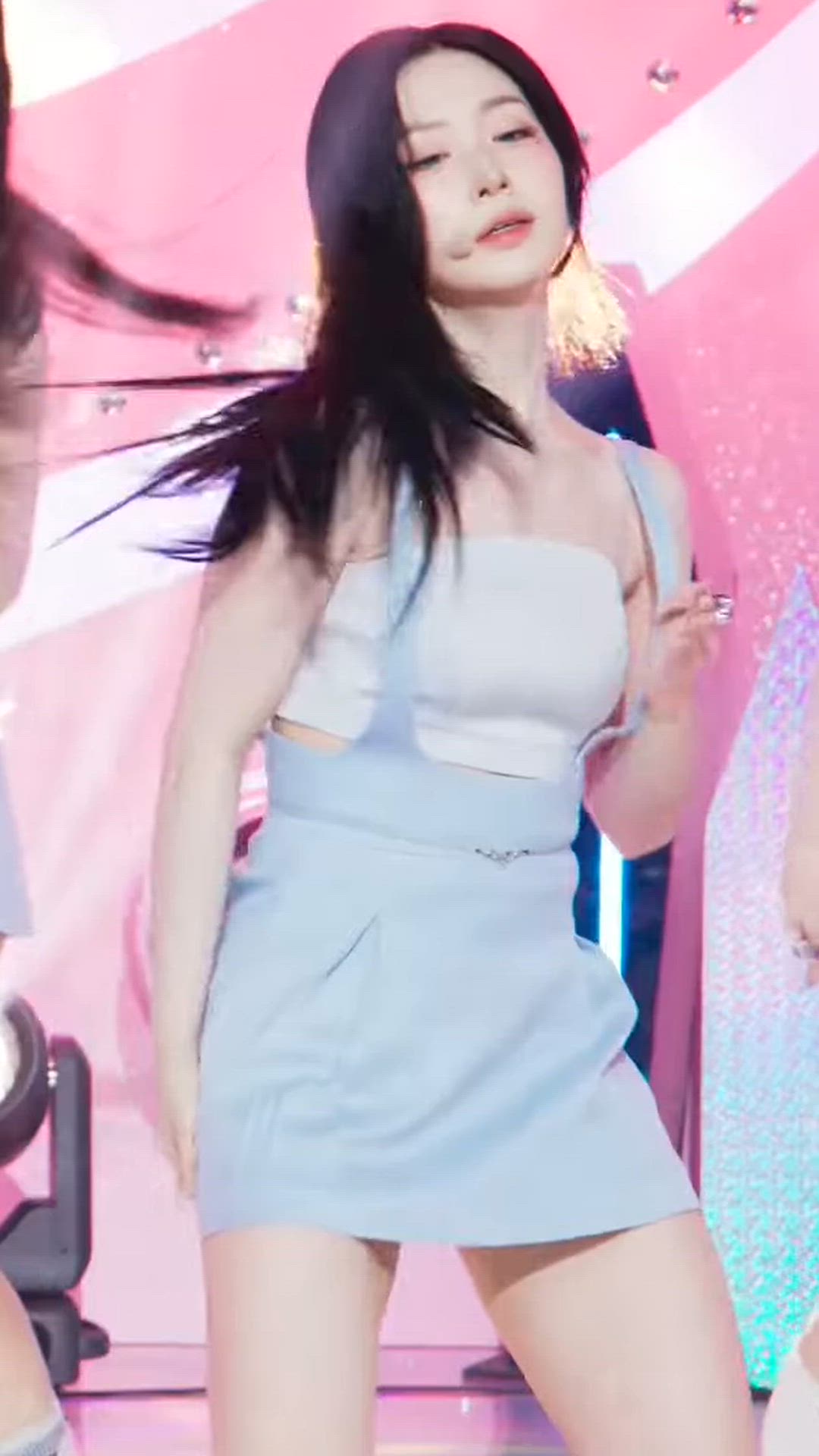 NMIXX Haewon presents a refreshing fashion style on stage. She highlights a fresh and lively charm by pairing a white bandeau top with a light blue suspender mini skirt, creating an idol stage look. The overall pastel tone coordination evokes a soft yet energetic vibe, showcasing a youthful and trendy sensibility.