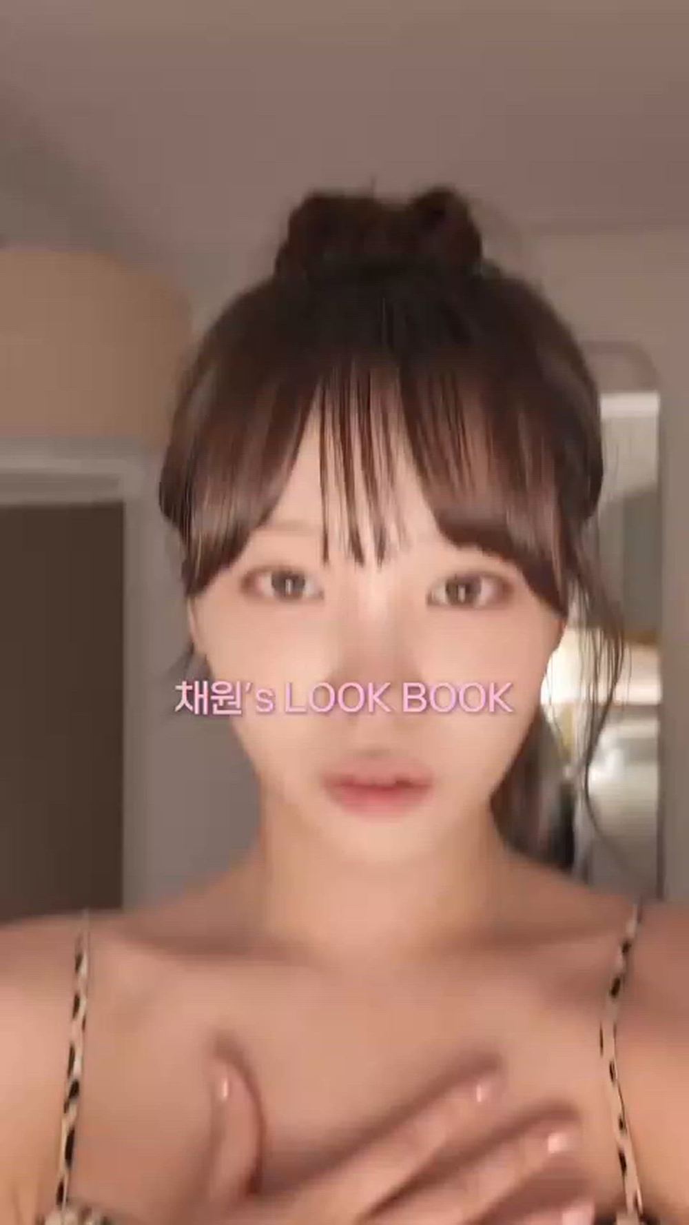 In the image, Chaewon showcases a comfortable yet stylish loungewear aesthetic. The leopard print thin-strap top, which appears to be her upper garment, features a soft texture that creates an elegant feminine appeal. This, combined with her naturally tied-up hairstyle, completes an attractive effortless chic ensemble suitable for daily wear. Overall, her look exudes both comfort and graceful charm, highlighting a sophisticated sleepwear-inspired fashion.