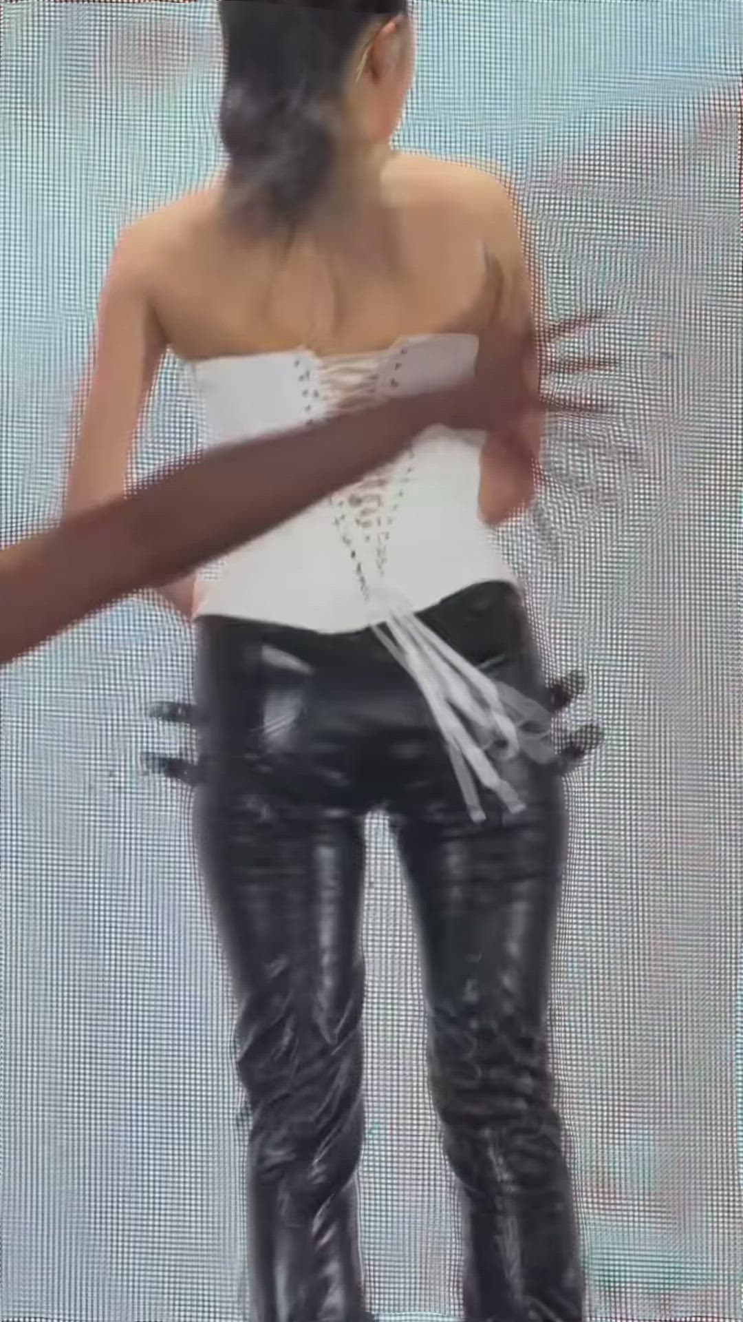 사진 속 지수는 강렬하고 엣지 있는 무대 의상을 선보입니다. 상의는 화이트 코르셋 탑으로 몸매를 강조하며, 하의는 광택 있는 블랙 가죽 팬츠를 매치하여 시크하면서도 대담한 분위기를 연출하고 있습니다. 전체적으로 블랙 앤 화이트의 대비가 돋보이며, 지수의 카리스마 있는 매력을 부각하는 스타일입니다. 이 의상은 특히 공연이나 특별한 이벤트에서 주목받는 무대 의상으로 활용하기에 적합합니다.