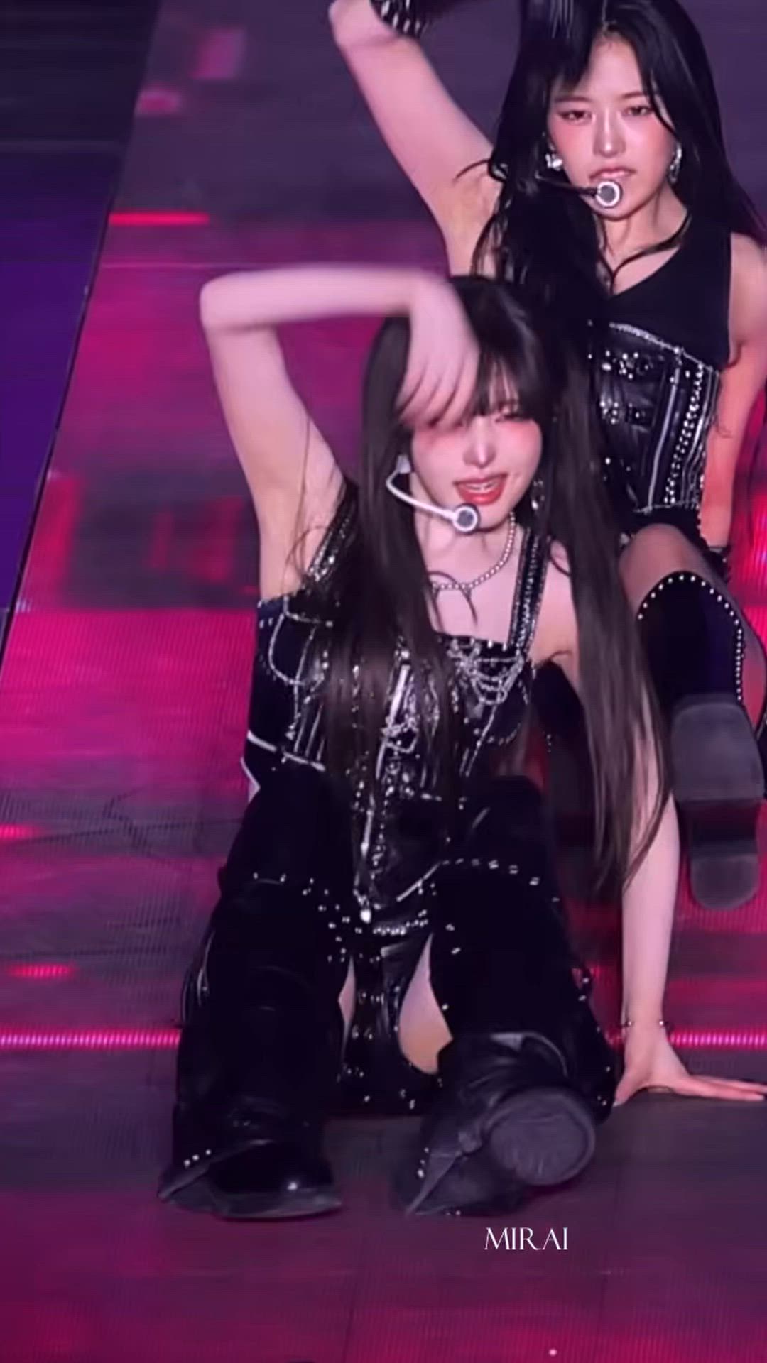 IVE Liz presented a rock chic stage costume. The all-black ensemble creates a sleek and intense atmosphere, while metallic details add a touch of glamour. This bold styling further enhances Liz's charismatic performance.