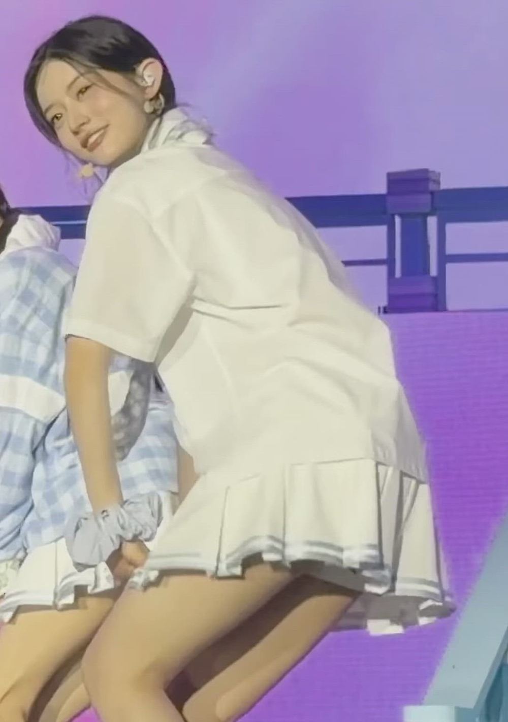 In the photo, Minju showcases a clean and youthful appeal with a school-inspired look. She pairs a white short-sleeved shirt with a pleated mini skirt, creating an overall bright and dynamic energy. This combination further emphasizes her fresh and lively image, completing a refined aesthetic. The styling is minimalistic yet features thoughtful details.
