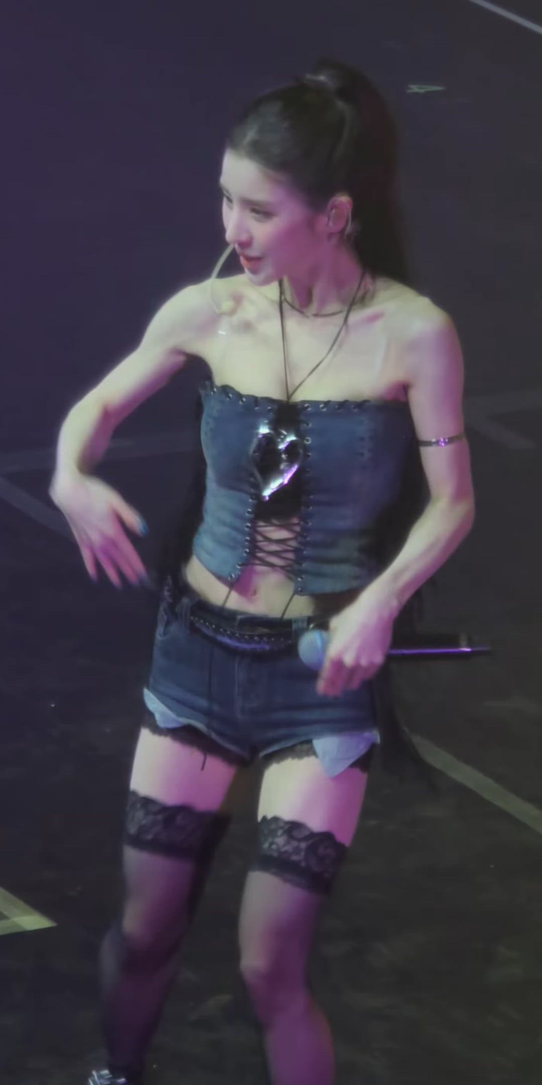 Heejin showcases a bold and trendy stage look, pairing a denim tube top with denim shorts. She completes the outfit with lace-top stockings and a large heart pendant necklace, emphasizing a funky and captivating aesthetic.