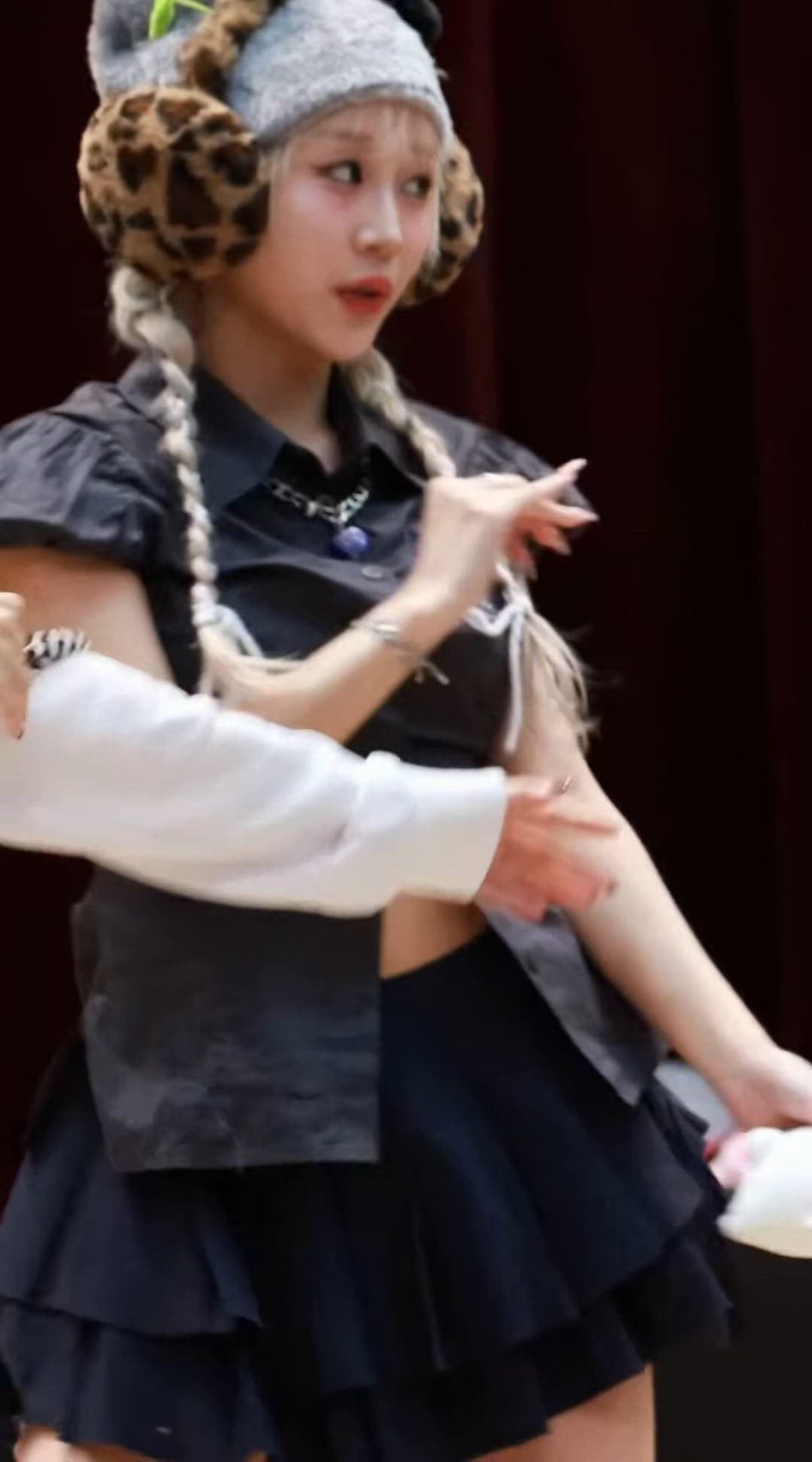 Kep1er Hikaru presents a sophisticated and trendy style, combining an all-black outfit with distinctive accessories. She emphasizes an active charm with a cropped top and a layered mini skirt, while adding playful yet edgy accents through leopard print earmuffs and a unique necklace, creating a vibrant and fashionable look.