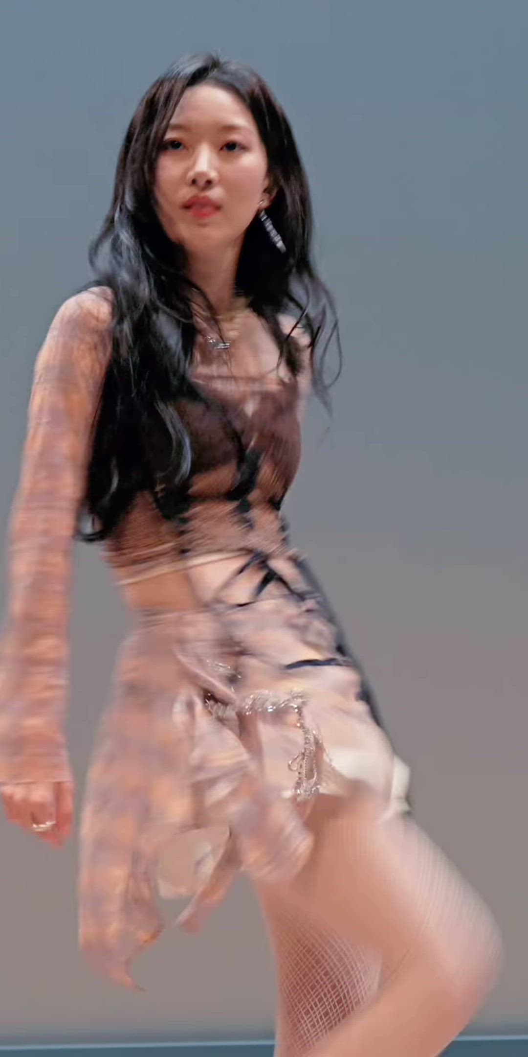 Youi is wearing a long-sleeved sheer top with an abstract brown-toned pattern. Its fitted silhouette emphasizes a slender form, and the mesh material offers a subtle transparency, adding a sophisticated vibe. The asymmetrical hemline contributes to its unique appeal.
