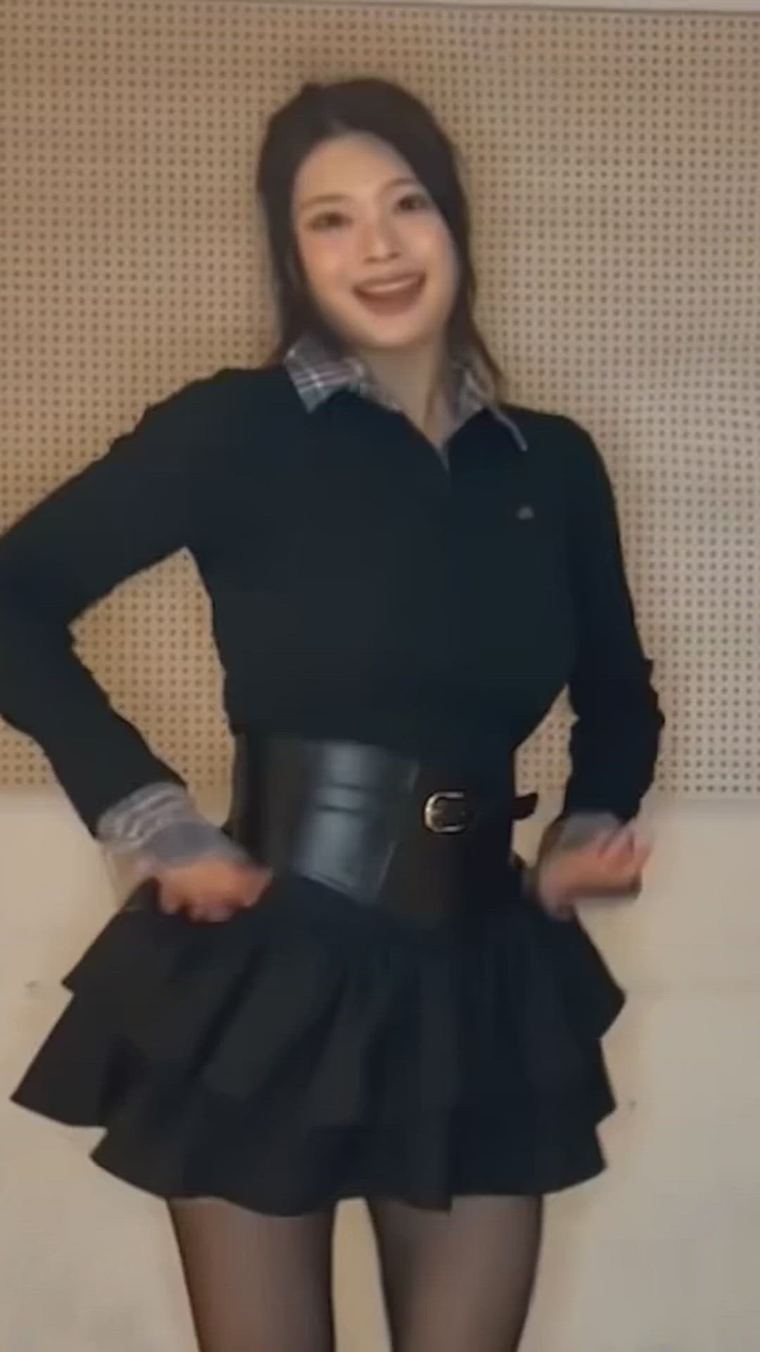 Swan presents a lively yet chic casual atmosphere, pairing a black polo knit top with a ruffle mini skirt. The plaid collar and cuff details on the top add a distinctive touch to the look, while a wide corset belt cinches the waist, emphasizing her silhouette. The overall black color scheme creates a cohesive and refined styling.