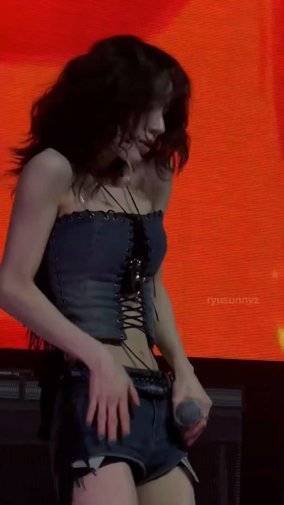 Heejin showcases a powerful and trendy style on stage. She is wearing a dark denim corset tube top that accentuates her waistline, paired with distressed cropped denim shorts, creating a chic vibe. This stage performance attire perfectly complements Heejin's charismatic performance, completing a striking look.