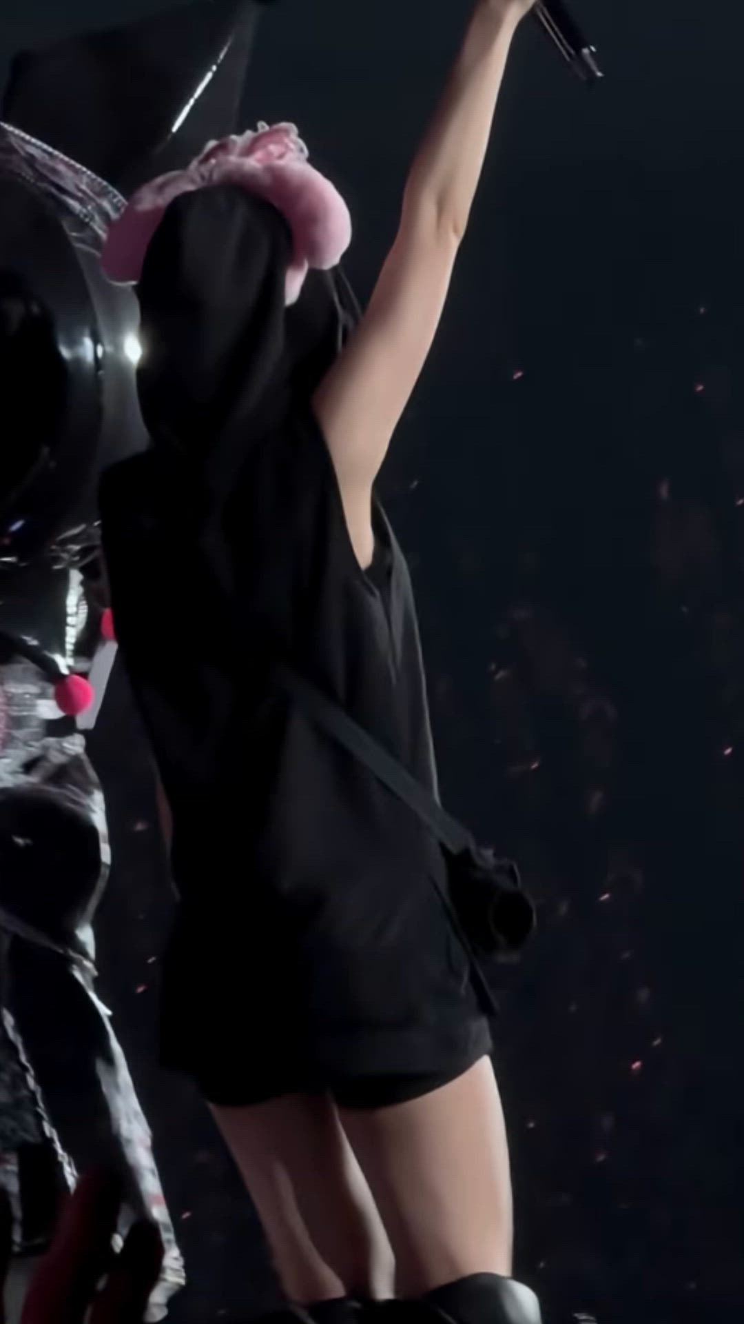 She wears black short hot pants, matching the top. The slim fit accentuates her leg line, making it suitable for active stage wear. Made from a stretchy material, it offers comfort and adds a chic appeal to the overall look. Similar styles of bottoms can be found from brands such as AllSaints or Diesel.