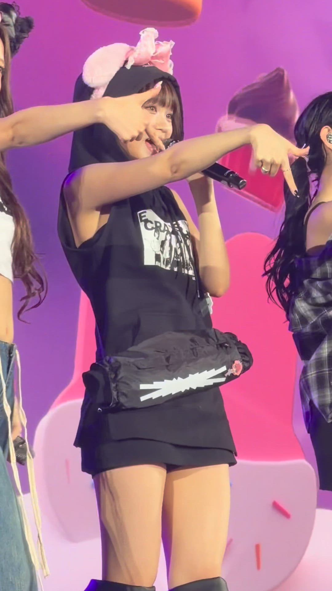 Chaewon presents a distinctive style on stage. She pairs a black sleeveless hooded T-shirt with a mini skirt, creating an active yet hip vibe. The pink animal ear headband adds a touch of cuteness to her idol look, completing a stage fashion that prominently features a streetwear sensibility.