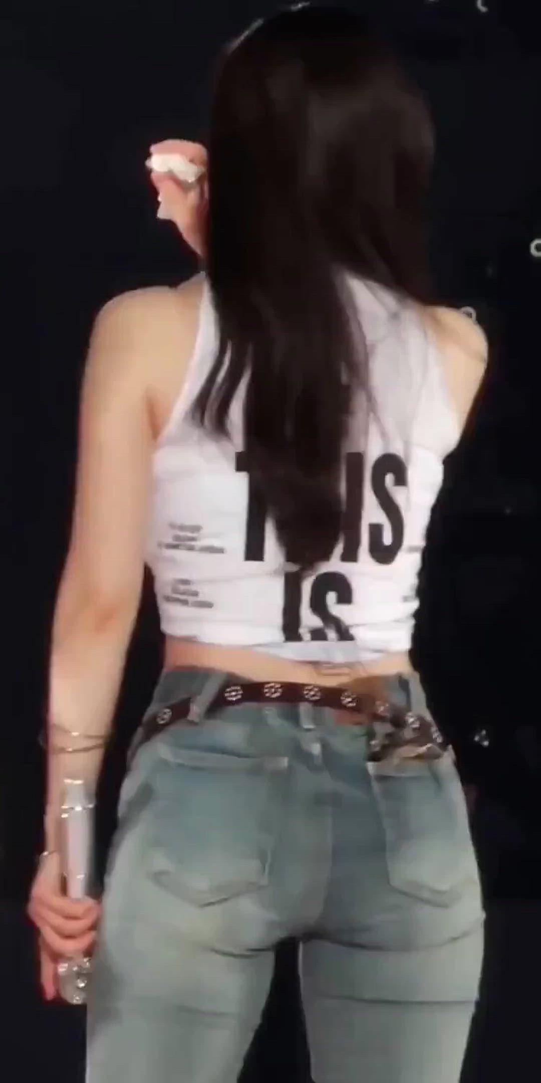 TWICE 다현은 편안하면서도 스타일리시한 무대 의상을 선보이고 있습니다. 흰색 크롭 탱크톱과 라이트 워싱 스키니진을 매치하여 활동적인 매력을 강조하며, 힙한 스트리트 패션의 감각을 더합니다. 전체적으로 다현의 날씬한 몸매를 잘 드러내는 실루엣으로, 캐주얼하면서도 트렌디한 분위기를 연출합니다.