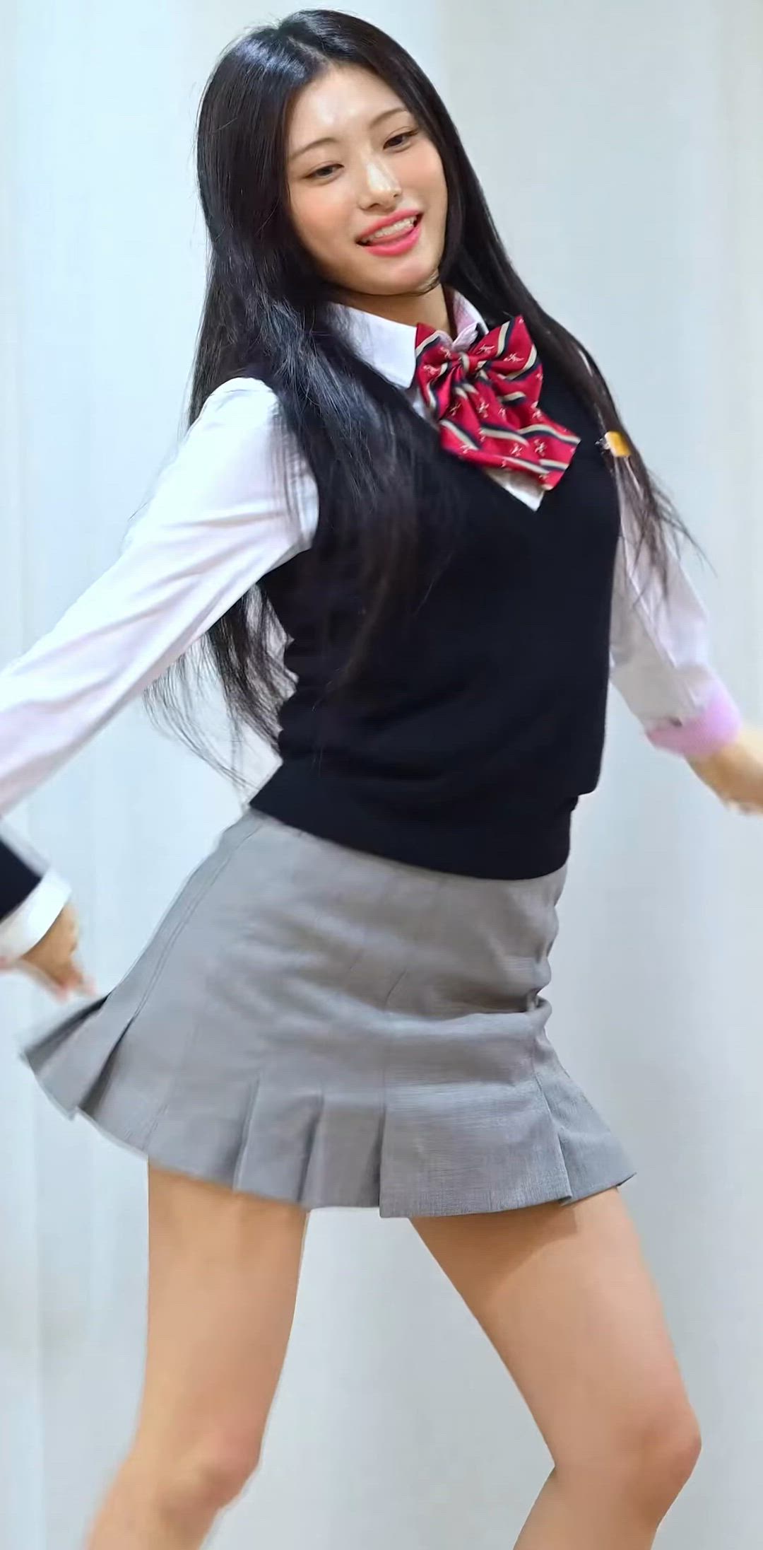 Jeewon presents a classic yet lively school look for the ODD YOUTH - Summer concept. She pairs a white shirt with a black knit vest and a gray pleated skirt, creating a distinct preppy style. This look emphasizes the charm of vibrant youth fashion and perfectly embodies the essence of a fresh campus look. The overall impression is neat and polished, with a bow tie and pleated skirt adding individual character.