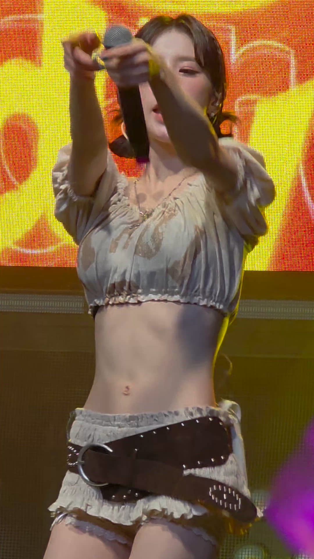 ARTMS의 희진은 보헤미안 시크 무드가 돋보이는 페스티벌 룩을 선보이고 있습니다. 얇은 소재의 크롭 상의와 러플 디테일의 미니 스커트를 매치하여 자유로우면서도 활기찬 분위기를 연출합니다. 특히, 과감한 크롭탑 디자인으로 허리 라인을 강조하며, 와이드 벨트와 펜던트 목걸이로 포인트를 더해 스타일리시한 무대를 완성합니다.