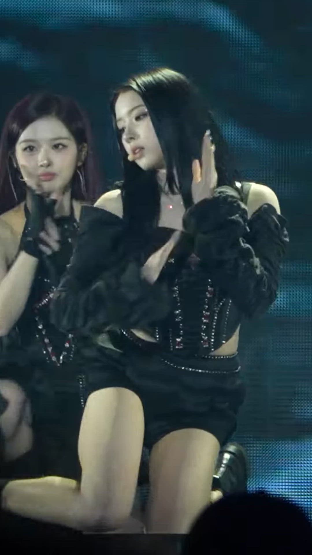 NMIXX 지우는 무대 위에서 강렬하면서도 세련된 블랙 룩을 선보이고 있습니다. 코르셋 스타일의 상의와 볼륨감 있는 오프숄더 디테일이 조화를 이루며, 전체적으로 글리터 장식으로 포인트를 주어 화려한 매력을 강조합니다. 시크하면서도 퍼포먼스에 최적화된 의상으로, 지우의 카리스마를 돋보이게 하는 스타일입니다.