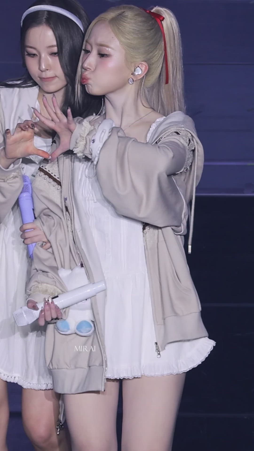 NMIXX Haewon presents a charming layered look, combining a beige zip-up hoodie with a white mini dress. The feminine ruffled details of the long-sleeve dress and the relaxed silhouette of the loose-fit hoodie harmonize, adding a soft appeal. A red ribbon accents her blonde high ponytail, emphasizing a lively touch. This everyday casual outfit allows her to appear both active and stylish on stage.