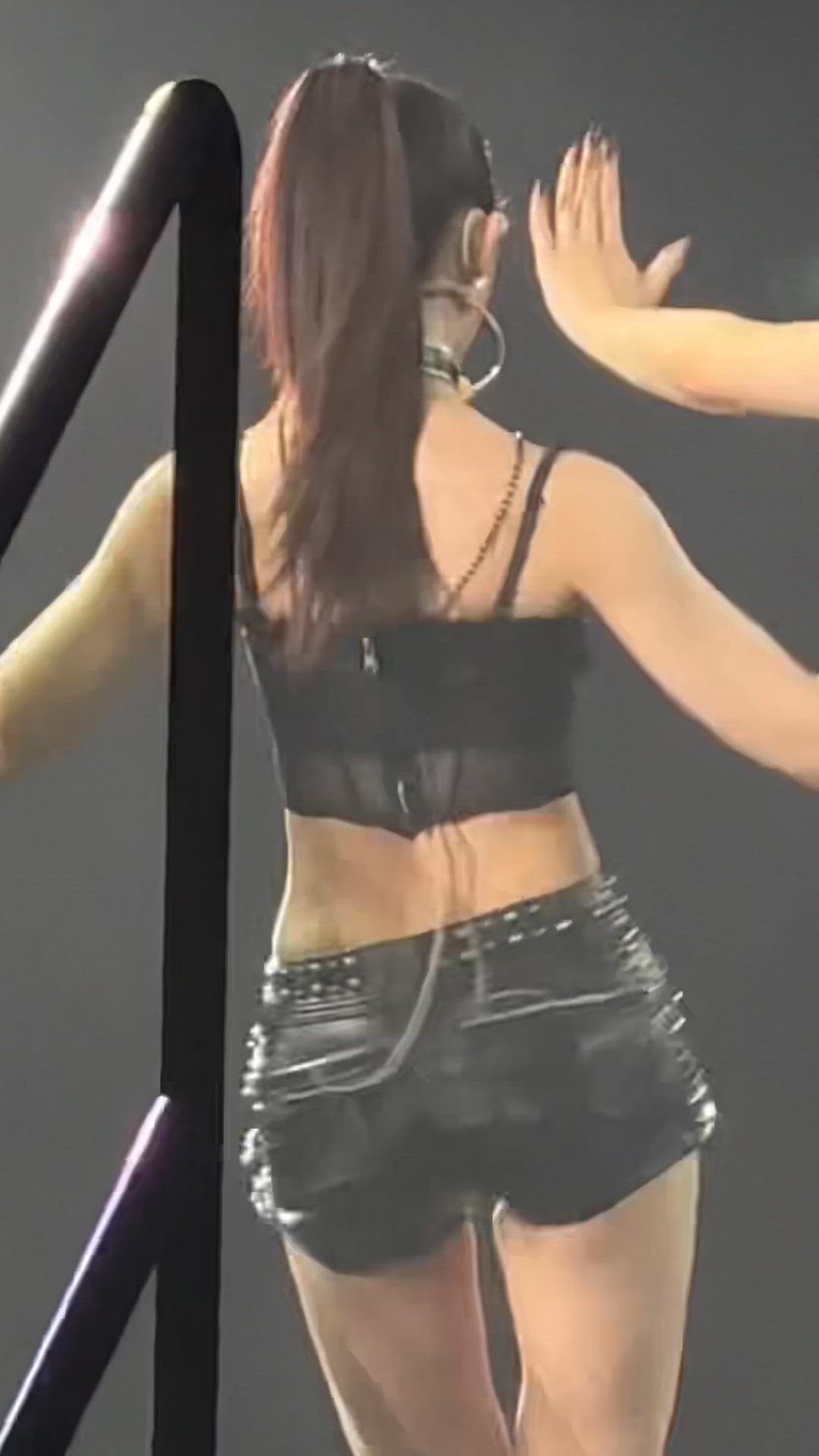 TWICE 쯔위는 과감한 무대 의상으로 강렬하고 매혹적인 스타일을 선보입니다. 블랙 컬러의 크롭탑과 핫팬츠를 매치하여 시크하면서도 도발적인 분위기를 연출하고 있습니다. 전체적으로 슬림한 핏과 코르셋 디테일, 스터드 장식 등 디테일이 돋보이는 룩으로, 쯔위의 건강하고 자신감 넘치는 매력을 강조합니다. 공연에 최적화된 편안하면서도 스타일리시한 퍼포먼스 웨어를 완벽하게 소화하고 있습니다.
