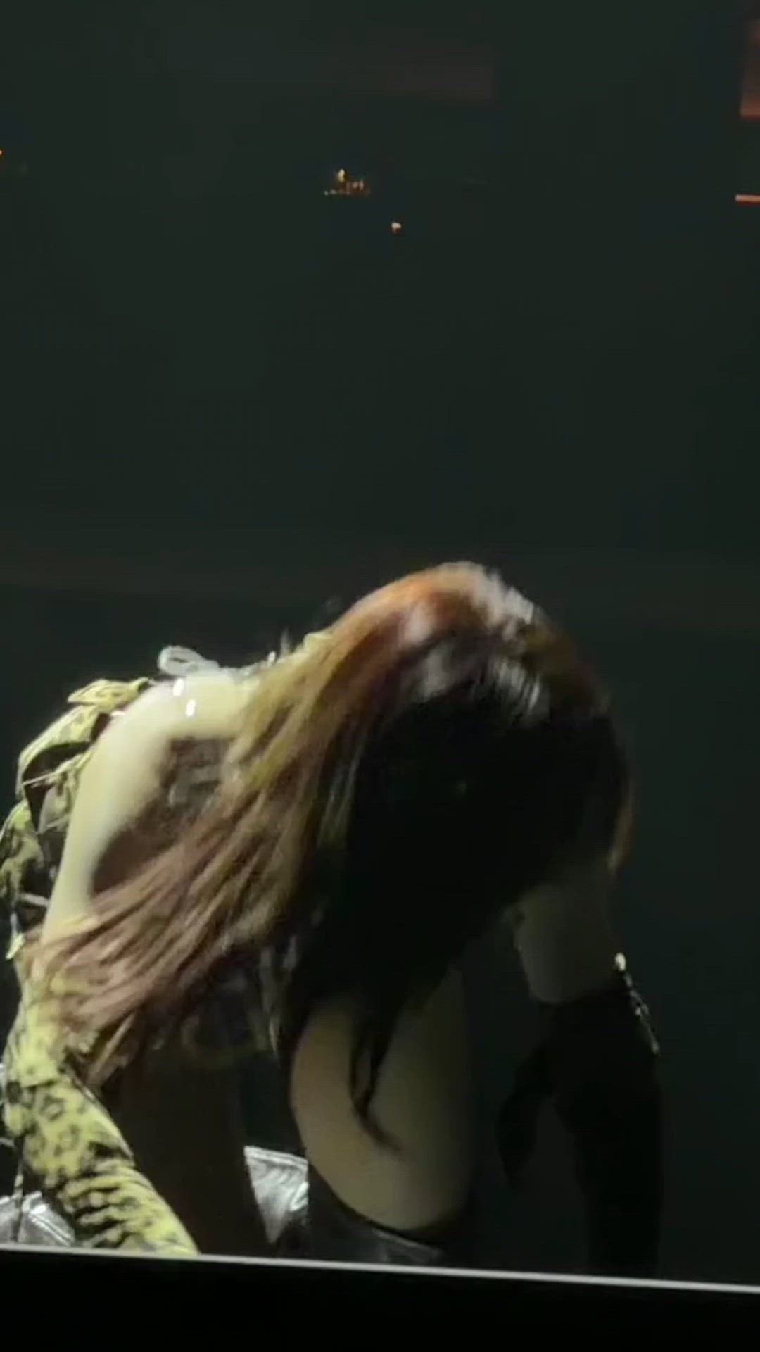 사진상으로 명확하게 보이지는 않지만, 상의와 조화를 이루는 어두운 색상의 하의로 예상됩니다. 몸에 붙는 슬림 핏의 가죽 팬츠나 코팅 진, 또는 미니 스커트일 가능성이 높습니다. 스테이지룩의 전체적인 과감한 분위기를 유지하기 위해 광택 있는 소재나 디테일이 더해졌을 것으로 보입니다. AllSaintsDiesel에서 유사한 스타일의 하의를 만나볼 수 있습니다.