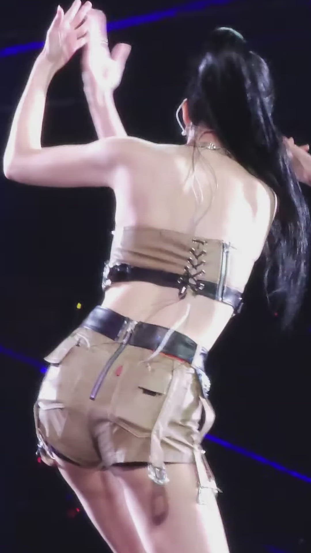 TWICE 미나는 무대 위에서 강렬하면서도 세련된 무대 의상을 선보이고 있습니다. 상의는 밴도 스타일의 코르셋 탑으로, 하의는 유틸리티 디테일이 돋보이는 쇼츠로 구성된 스타일입니다. 전체적으로 카키 베이지 톤의 의상에 블랙 스트랩과 레이스업 디테일이 더해져 엣지 있는 분위기를 연출합니다. 미나의 건강한 매력과 다이내믹한 퍼포먼스를 더욱 돋보이게 하는 스타일입니다.