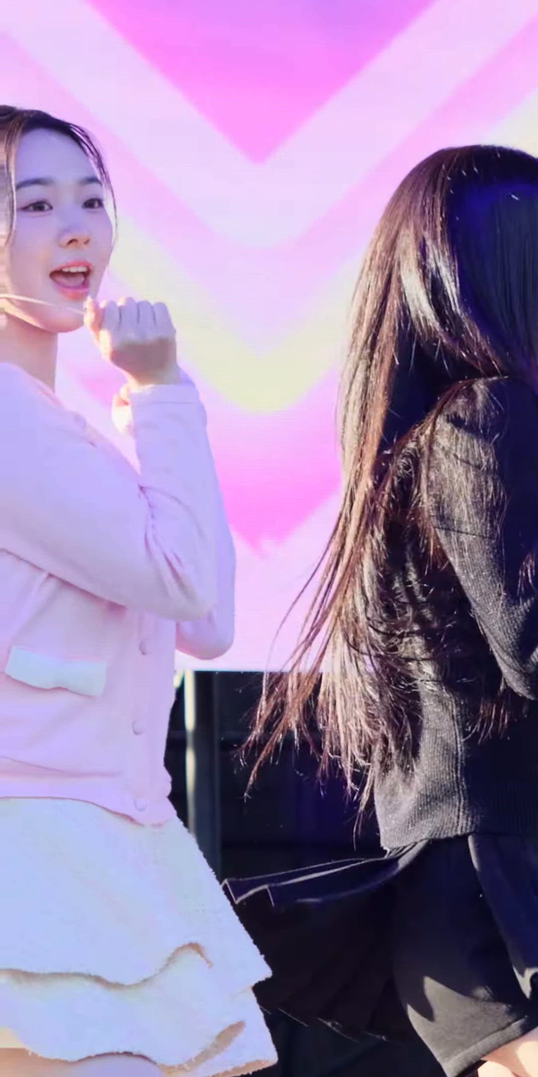사진 속 수민은 화사한 핑크색 상의와 크림색 미니 스커트를 매치하여 사랑스러운 무대를 선보이고 있습니다. 전체적으로 밝고 경쾌한 색감과 러블리 캐주얼 스타일이 돋보이는 아이돌 무대 의상입니다. 특히, 상의의 리본 디테일과 하의의 레이어드 디자인이 어우러져 젊고 발랄한 에너지를 전달하며, 봄 데이트룩으로도 손색없는 패션 센스를 보여줍니다.